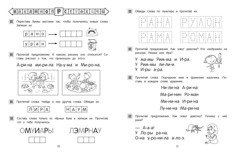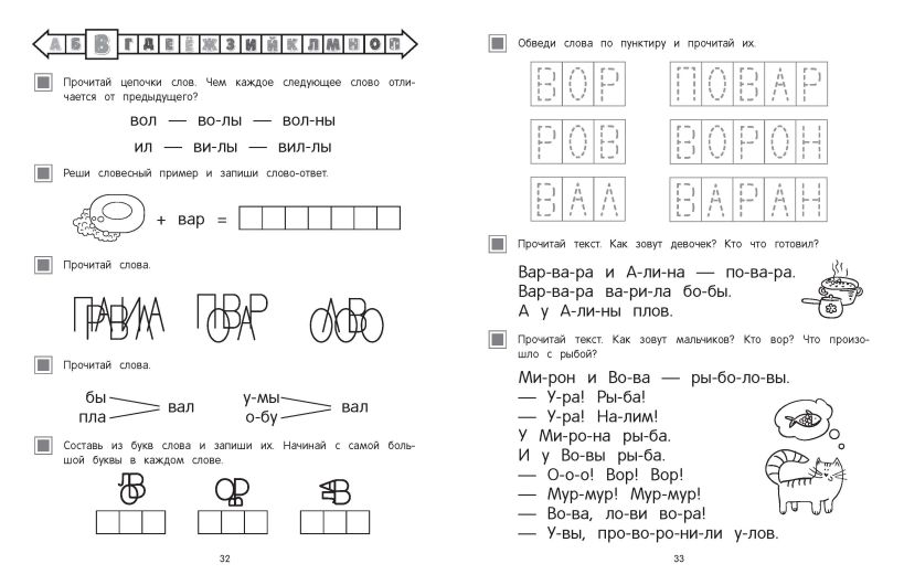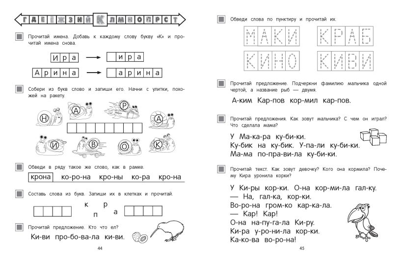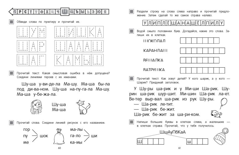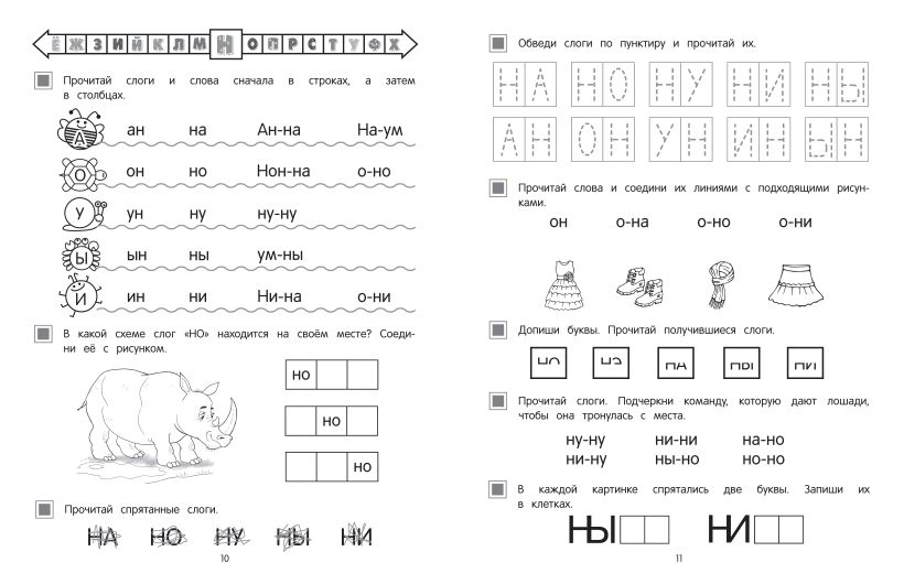 Выполняя увлекательные упражнения, дошкольник научится соединять буквы в слоги и читать по слогам простые слова, небольшие предложения и тексты, делить слова на слоги и рисовать слоговые схемы, понимать и пересказывать прочитанное, отвечать на вопросы, а также сможет развить связную речь.