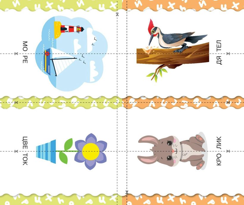 Необычное пособие для дошкольников поможет научиться ребёнку от 3 лет чтению по слогам. При помощи ножниц книга превращается в комплект из 64 двусторонних обучающих карточек, которые нужно попарно соединять в слова. В этом ребёнку помогут яркие привлекательные иллюстрации и цвет обрамляющей рамки, который ограничивает выбор карточек в наборе. Перемешайте карточки и предложите дошкольнику самостоятельно выбрать одну из них. Затем он должен самостоятельно подобрать к ней пару, чтобы из двух половинок сложилась картинка, и прочитать слово. Весь процесс очень похож на увлекательную игру. Пособие можно использовать как для домашнего обучения, так и в детском саду. Книга для детей поможет дошкольнику хорошо выучить слоги и запомнить слова, которые из них получаются, развить внимание, память, логическое и творческое мышление, чтобы стать лучшим учеником при поступлении в школу.