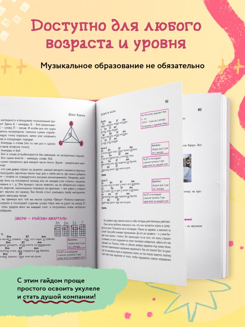 Вместе с самоучителем по игре на укулеле от Даши Кирпич этот процесс станет не только в разы понятнее, но и приятнее! Ведь каждый урок сопровождается пошаговками, иллюстрациями и веселыми советами, а объяснения написаны не сухим академичным языком, а в формате дружеской беседы.
