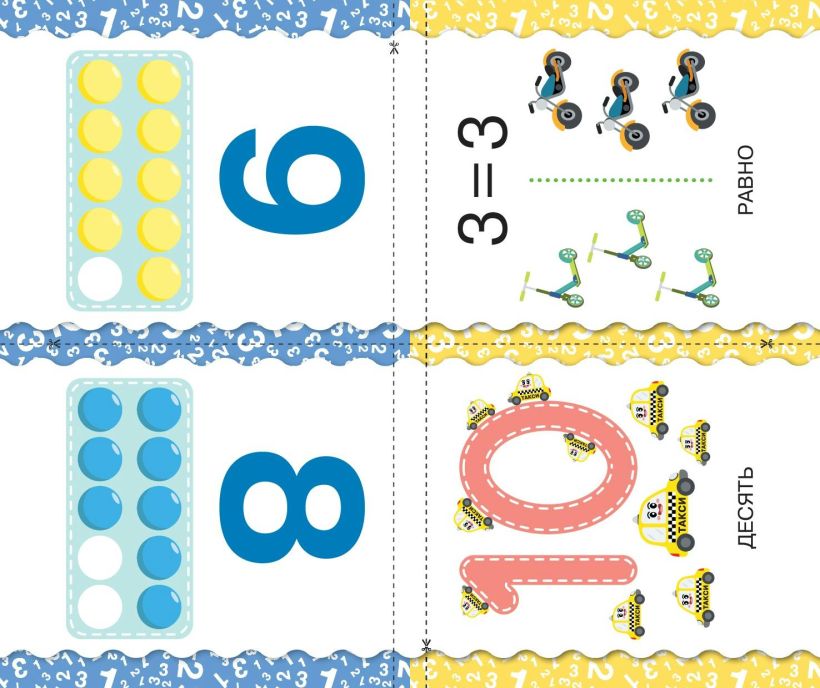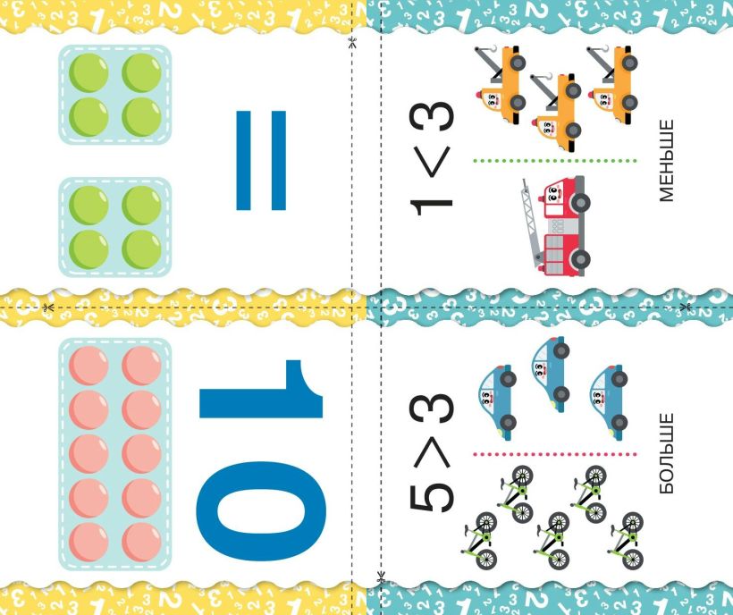 Необычное пособие для дошкольников поможет ребёнку от 3 лет научиться считать. При помощи ножниц книга превращается в комплект из 32 двусторонних обучающих карточек. Перемешайте их и предложите дошкольнику самостоятельно выбрать какую-то одну. Назовите цифру и вместе с ребёнком сосчитайте предметы, которые она обозначает. На карточках с арифметическими знаками наглядная инструкция по их применению, которую можно использовать как памятку. Выкладывая карточки на ровной поверхности, тренируйтесь выполнять действия сложения, вычитания, сравнения. Пособие можно использовать как для домашнего обучения, так и в детском саду. Книга для детей поможет дошкольнику сделать первые шаги в освоении математики, развить внимание, память, логическое мышление, эстетическое восприятие, чтобы стать лучшим учеником при поступлении в школу.