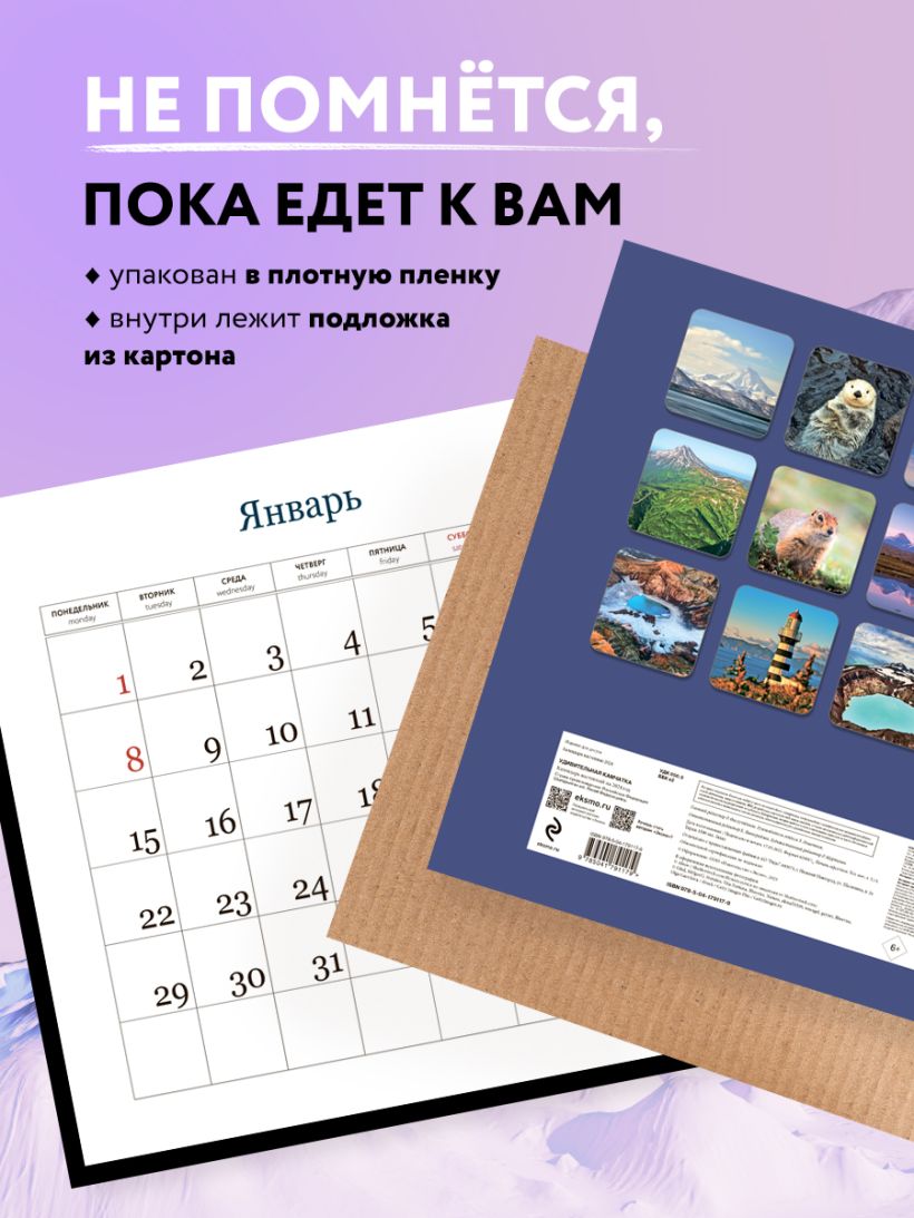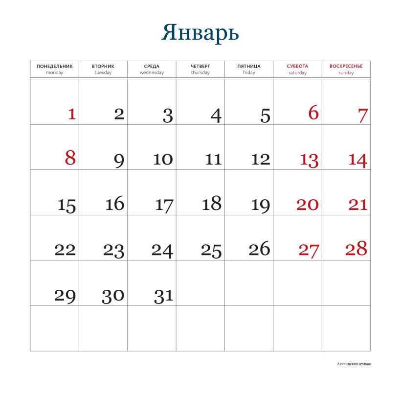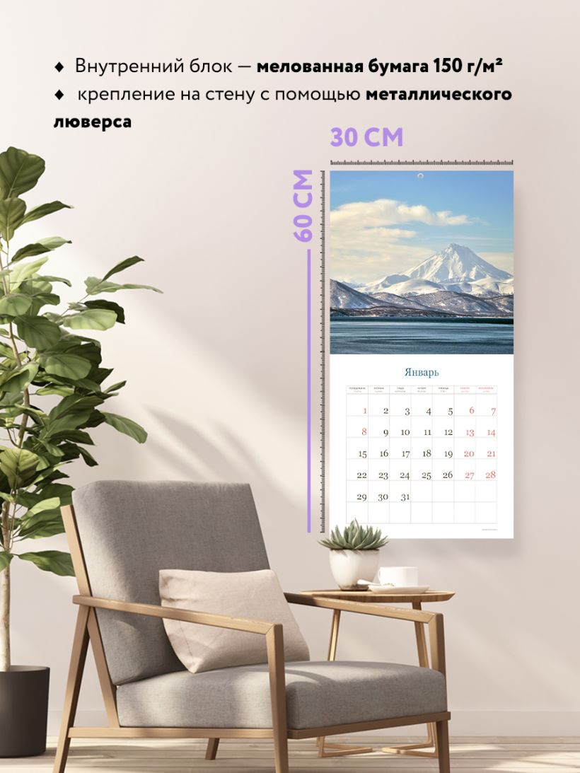 Благодаря большому формату и высокому качеству изображений этот календарь может стать отличным дополнением интерьера. В нем также отмечены выходные дни, а просторная сетка позволяет удобно планировать время и записывать важные события.