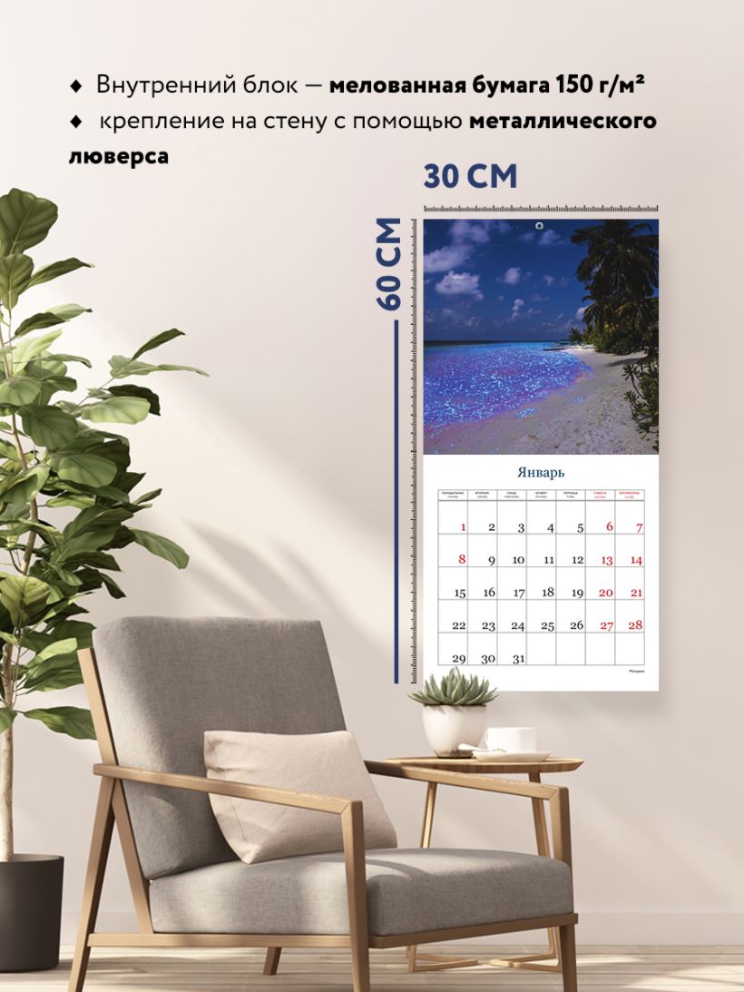 Благодаря большому формату и высокому качеству изображений этот календарь может стать отличным дополнением интерьера. В нем также отмечены выходные дни, а просторная сетка позволяет удобно планировать время и записывать важные события.