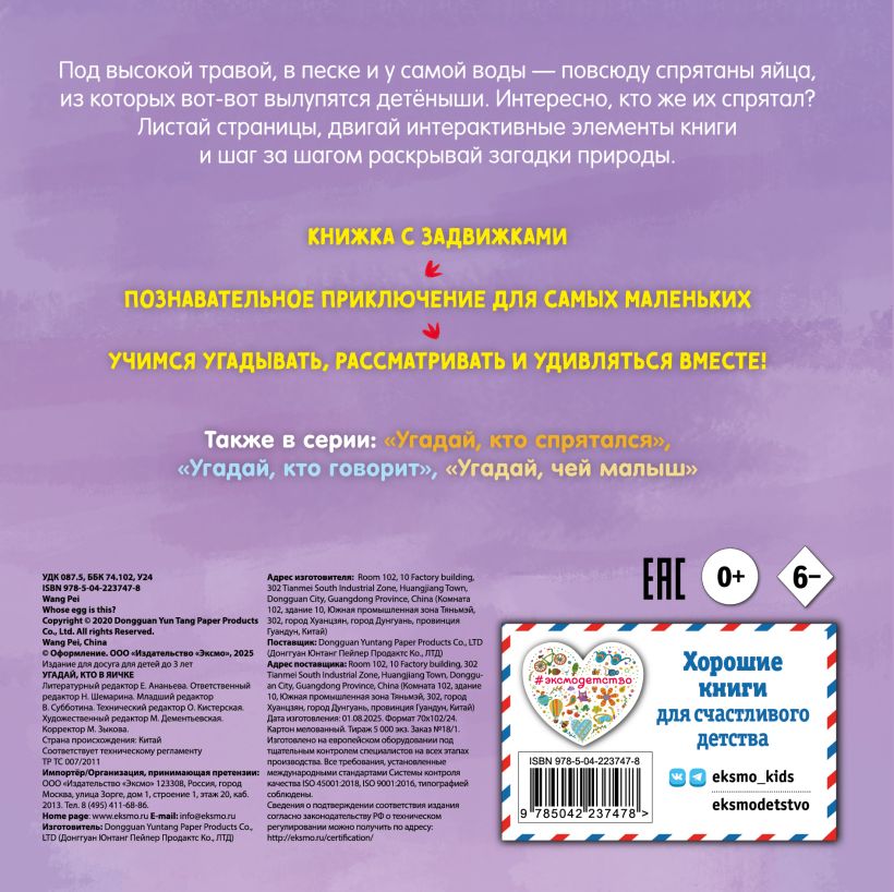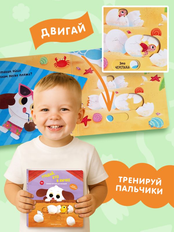 Кто вылупится из этого яичка? Цыплёнок или черепашка? А может быть, зубастый крокодильчик? Скорее ищите ответы на красочных страницах книжки с задвижками!