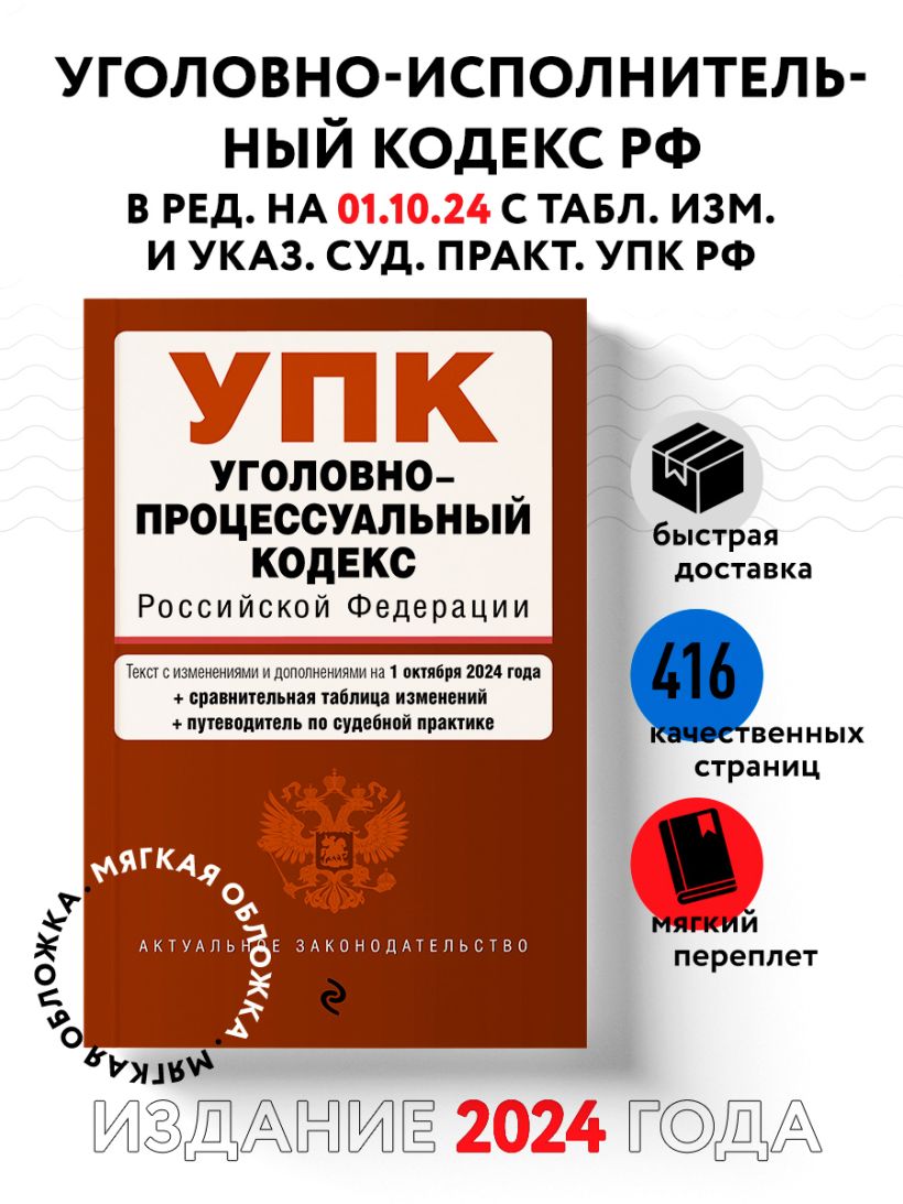 Настоящее издание содержит текст Уголовно-процессуального кодекса Российской Федерации с изменениями и дополнениями на 1 октября 2024 года с удобной навигацией, таблицей изменений и путеводителем по судебной практике. Если есть изменения, вступающие в силу позднее, то вместе с редакцией нормы, действующей на эту дату, приводится норма в новой редакции и указывается дата, с которой она вступает в силу.