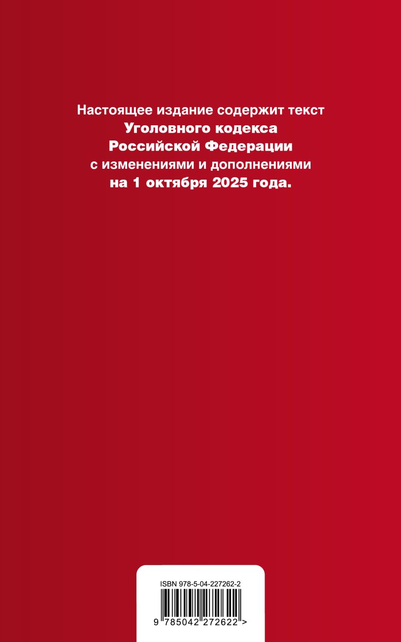 Настоящее издание содержит текст Уголовного кодекса Российской Федерации с изменениями и дополнениями на 1 октября 2025 года с удобной навигацией, таблицей изменений и путеводителем по судебной практике. Если существуют изменения, вступающие в силу позднее, то вместе с редакцией нормы, действующей на эту дату, приводится норма в новой редакции и указывается дата, с которой она вступает в силу.