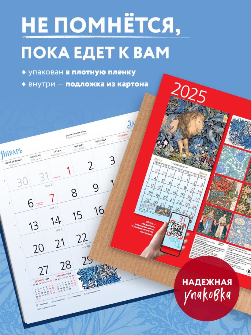 Практичный и эстетичный, этот календарь каждый месяц будет радовать вас. Прекрасные картины органично дополнят любой интерьер и помогут планировать время. В этом календаре представлены шедевры кисти Уильяма Морриса.