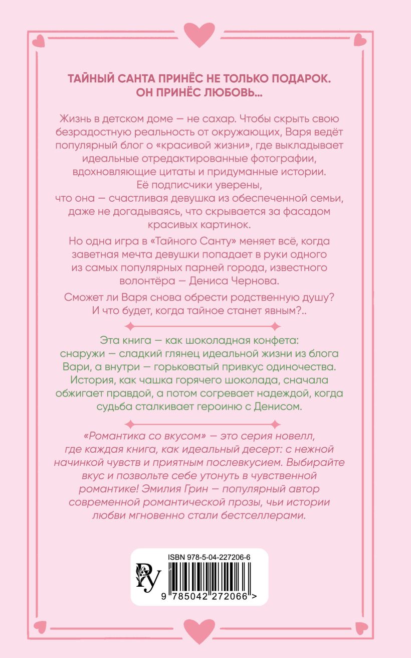 Новинка Эмилии Грин — популярного автора романтической прозы, чьи истории любви мгновенно стали бестселлерами. Эта книга — как шоколадная конфета: снаружи — сладкий глянец идеальной жизни из блога Вари, а внутри — горьковатый привкус одиночества. История, как чашка горячего шоколада, сначала обжигает правдой, а потом согревает надеждой, когда судьба сталкивает героиню с Денисом.