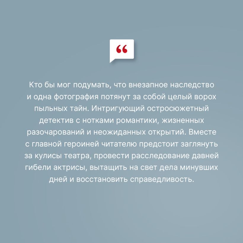 Анна выяснила, что костюм принадлежал талантливой актрисе Тамиле Тепляковой, но поговорить с ней не смогла. Оказывается, та погибла прямо во время спектакля, упав в люк под сценой, который случайно оказался открытым! И произошло это примерно в то же время, когда было сделано пугающее фото…