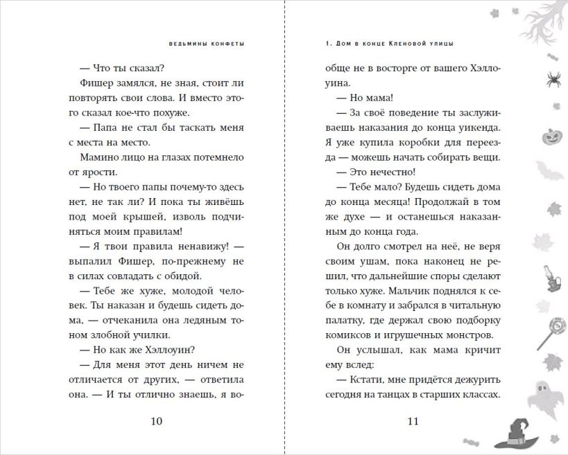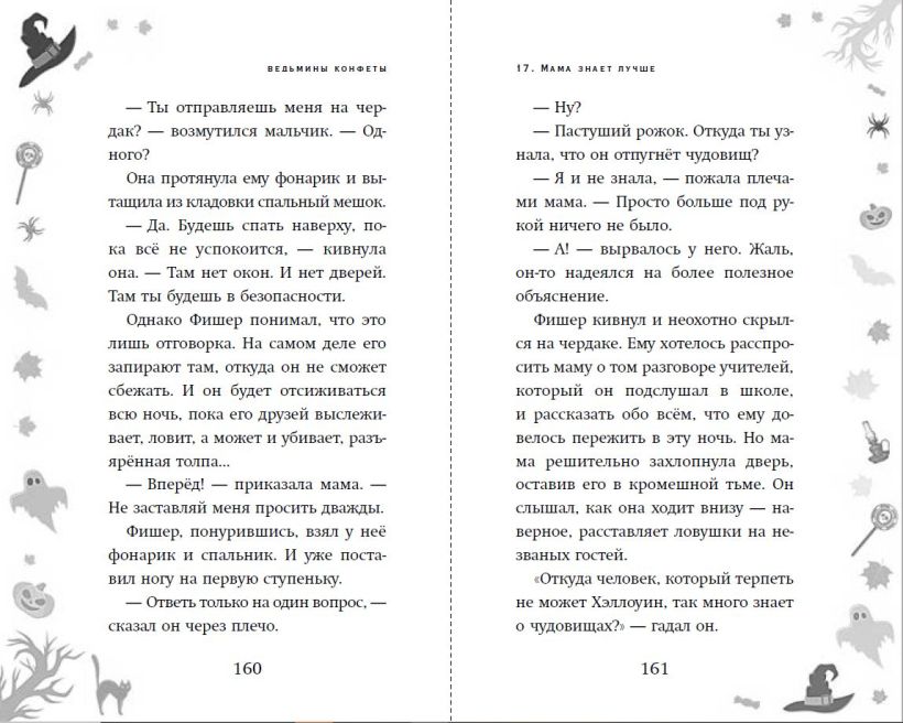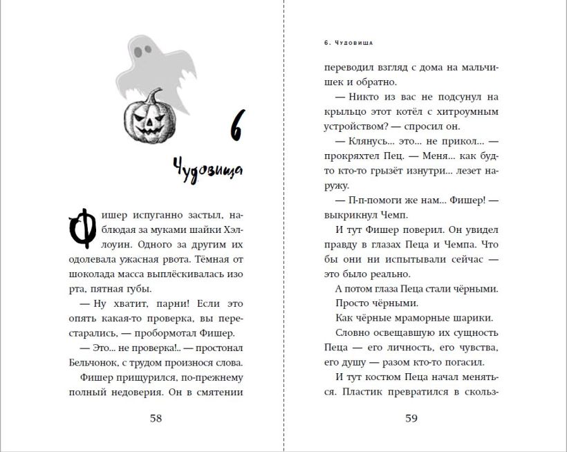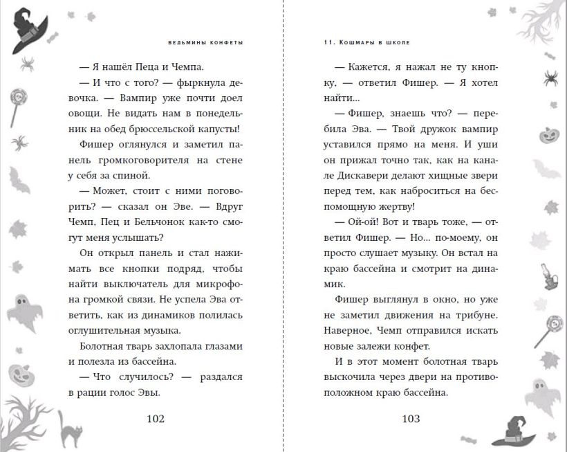 Фишер любил — нет, просто обожал! — Хэллоуин. И, конечно, в праздничный вечер отправился с друзьями на охоту за сладостями. Их команда во что бы то ни стало решила выиграть соревнование по сбору конфет. Так ребята оказались перед крыльцом старого заброшенного дома, в котором когда-то жила ведьма. И увидели чёрный котелок, полный шоколадных батончиков… Эти чудесные конфеты таяли во рту! Вот только, съев их, друзья превратились в чудовищ. Монстров, которых изображали их карнавальные костюмы! И теперь по городу рыщут настоящая болотная тварь, вампир и вор-невидимка! Можно ли вернуть им человеческий облик? И что для этого нужно сделать? Чтобы помочь друзьям, у Фишера есть время до восхода солнца. Иначе ребята навсегда останутся чудовищами!