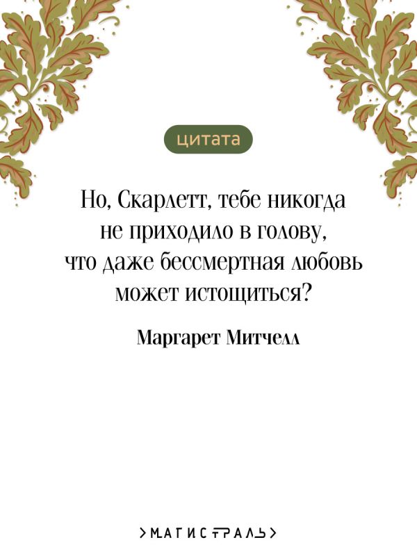 «Унесенные ветром» — роман о том, что любовь к жизни бывает важнее любви; о том, что заставляет нас жить — что бы ни творилось вокруг.