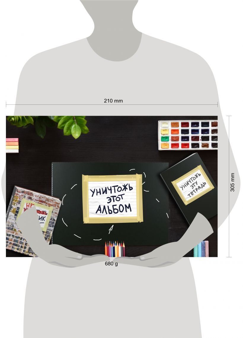 В комплект входят: Уничтожь этот альбом (черный, с заданиями) (формат А4, офсет 160 гр., 50 страниц, евроспираль), Не уничтожай этот дневник (48 л., кирпичи), Уничтожь эту тетрадь (А5, 48 л., УФ-лак, с заданиями, черная).