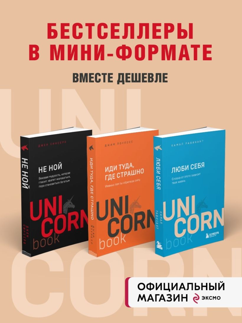 В состав комплекта вошли три книги серии "UnicornBook" : Иди туда, где страшно. Именно там ты обретешь силу ; ЛЮБИ СЕБЯ. Словно от этого зависит твоя жизнь ; НЕ НОЙ. Вековая мудрость, которая гласит: хватит жаловаться пора становиться богатым