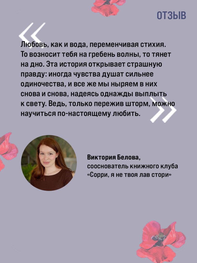 «В этой истории два интересных и ярких персонажа, чья любовь преодолевает препятствия. Как жить дальше, когда твое сердце будто вырвано из груди? Как простить себя, когда другие тоже считают тебя виноватым? Как подпустить к себе хорошего человека, если не заслуживаешь счастья? Много интересных философских мыслей, много горячих и пылких сцен, много ситуаций, о которых хочется поразмышлять, и чудесный второстепенный герой, в которого невозможно не влюбиться». — ОЛЬГА АДБУГАЛИМОВА, книжный блогер