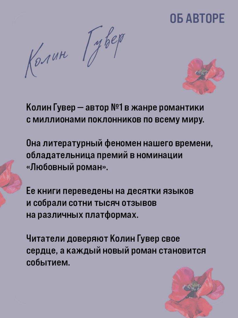 Колин Гувер — автор, которому читатели доверяют свое сердце. Она — мировой тренд, литературный феномен нашего времени, троекратная обладательница премии Goodreads Choice Award в номинации «любовный роман». Ее произведения переведены на десятки языков. Продажи книг Колин Гувер превысили продажи Стивена Кинга и Джорджа Мартина.