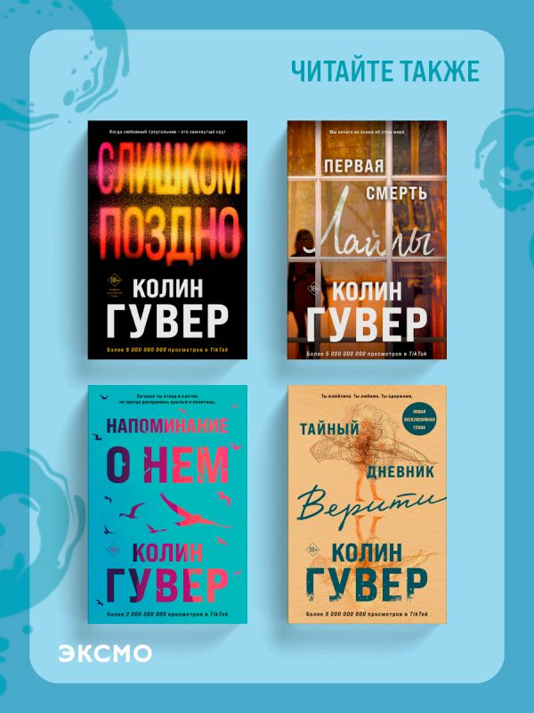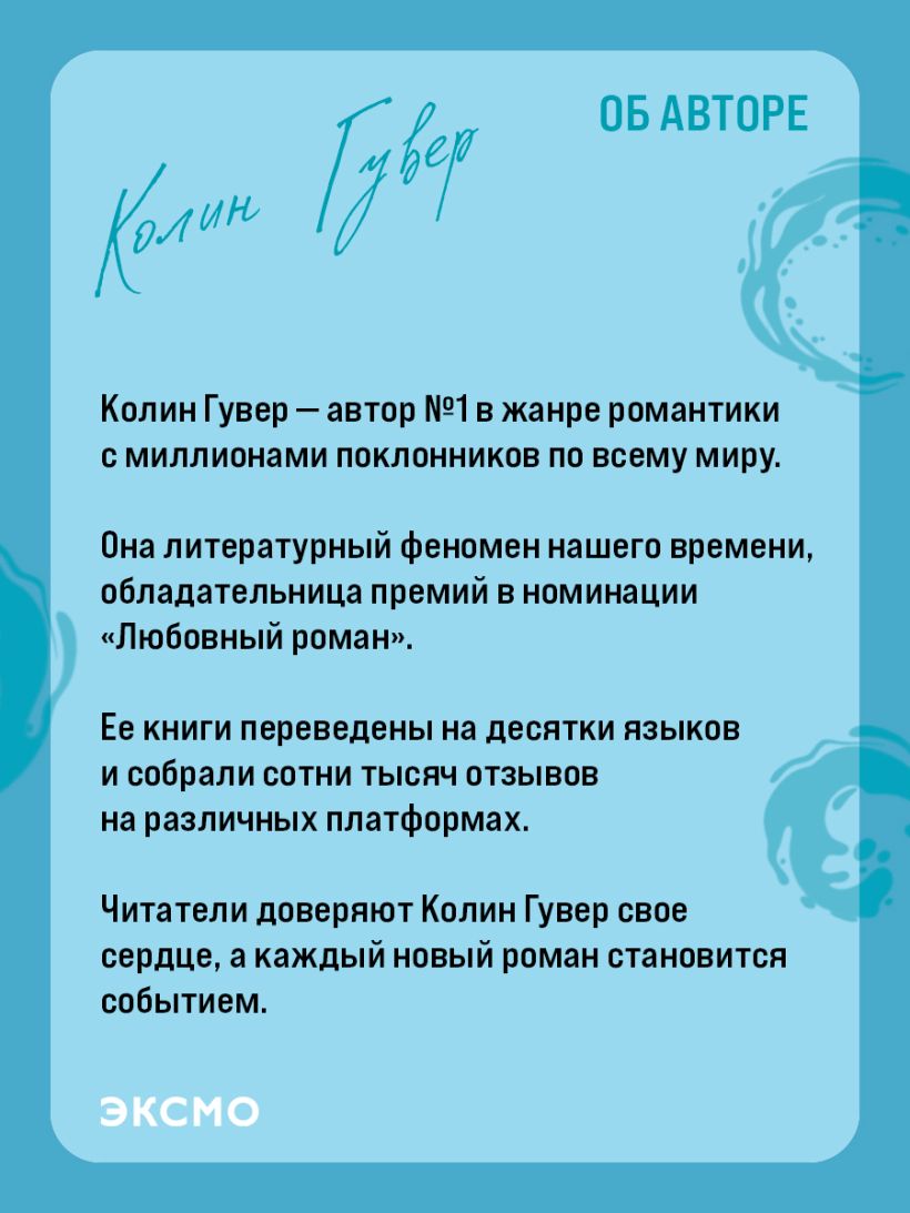 Колин Гувер — автор, которому читатели доверяют свое сердце. Она — мировой тренд, литературный феномен нашего времени, троекратная обладательница премии Goodreads Choice Award в номинации «любовный роман». Ее произведения переведены на десятки языков. Продажи книг Колин Гувер превысили продажи Стивена Кинга и Джорджа Мартина.