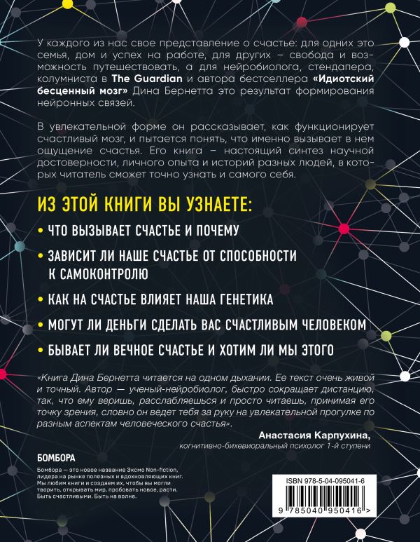 У каждого из нас свое представление о счастье: для одних – это семья, дом и успех на работе, для других – свобода и возможность путешествовать, а для нейробиолога, стендапера, колумниста в The Guardian и автора бестселлера «Идиотский бесценный мозг» Дина Бернетта – это результат формирования нейронных связей. В увлекательной форме он рассказывает, как функционирует счастливый мозг, и пытается понять то, что именно вызывает в нем ощущение счастья. Его книга – настоящий синтез научной достоверности, личного опыта и историй разных людей, в которых читатель сможет точно узнать и самого себя.