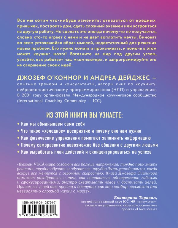Принято считать, что мозг руководит всем в человеческом теле: мыслями и действиями, чувствами и эмоциями. А что, если можно «натренировать» его и сделать своим главным помощником, а не боссом? Опытные коучи, британские консультанты по личностному росту Джозеф О’Коннор и Андреа Дейджес рассказывают, как использовать последние достижения нейронауки для того, чтобы помочь себе и другим учиться, меняться, развиваться и быть лучшими.