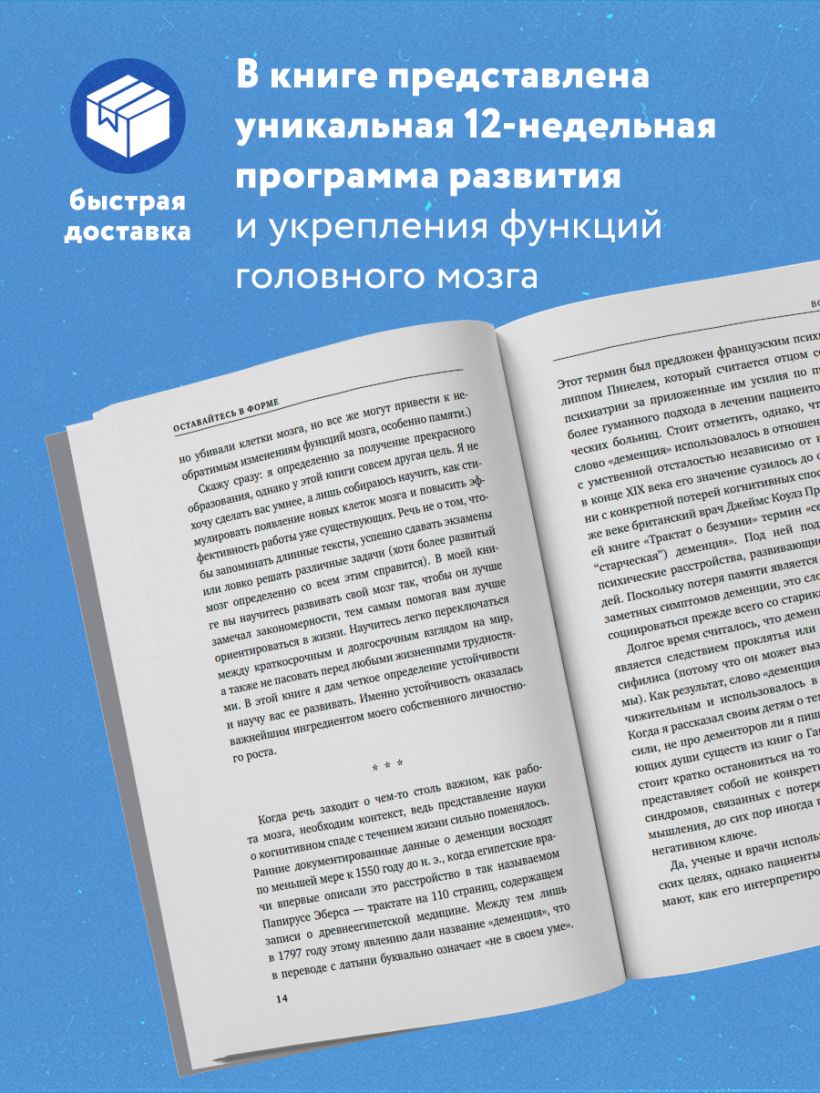 «Чем старше мы становимся, тем чаще задумываемся о том, какой будет наша старость, как сберечь здоровье и ясный ум. Эта книга расскажет, как снизить риск когнитивного спада, и поможет сориентироваться и вовремя принять важные решения, если диагноз уже поставлен. Ученые и медики ищут способы помочь людям с когнитивными нарушениями как можно дольше сохранять память и здравый рассудок, — а лучше вовсе избежать возрастных заболеваний мозга, — и сейчас на этом пути заметны первые, но довольно воодушевляющие успехи». — ЕЛЕНА БЕЛОВА, биохимик, биоинформатик и нейрофизиолог. Пишет для научного журнала «Биомолекула», ведет телеграмм-канал hippopocampus и читает лекции для широкого круга слушателей. Автор книги «Автостопом по мозгу. Когда вся вселенная у тебя в голове»