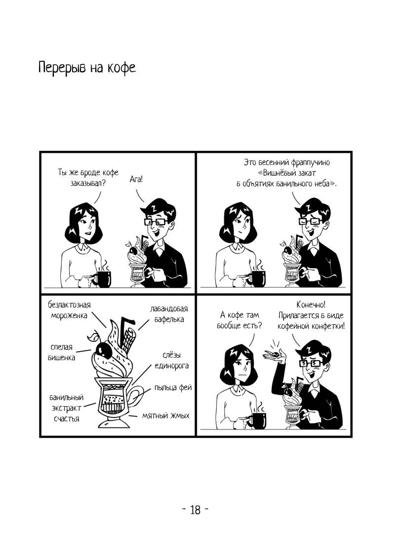 «Утренняя чашка комиксов» — это маленькие порции доброты и милоты в формате стрипов! Герои мини-комиксов шутят про творчество, кофе, отношения и путешествия в фэнтезийных мирах, а ещё обсуждают «Звездные войны», ужастики и французское кино. Одна страничка – один комикс, лёгкий и заряжающий настроением словно чашечка кофе поутру!