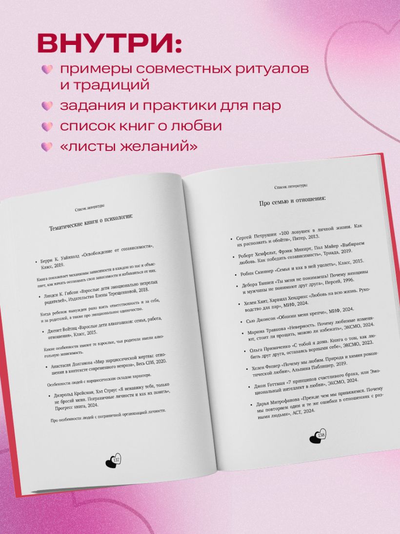 Анастасия Сагирова, семейный психолог с многолетним опытом, собрала примеры совместных ритуалов и традиций, задания и практики для пар, список книг о любви, а также «листы желаний».