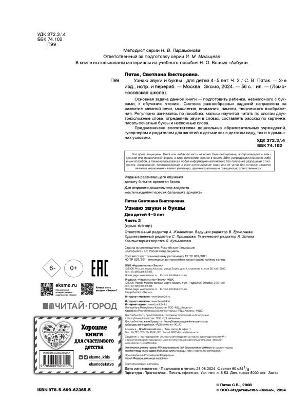 Современная школа предъявляет очень высокие требования к детям, которые поступают в 1 класс, поэтому дошкольная подготовка является важнейшим этапом для успешного старта. Эта развивашка, предназначенная для детей 5, 6, 7 лет, поможет ребенку научиться произвольно фокусировать внимание. Каждая страница тренажера предлагает множество интересных и разнообразных упражнений, которые помогут развить логическое мышление и познавательные способности, закрепить и потренировать мелкую моторику. Кроме того, пособие содержит детские развивающие игры, такие как нахождение логических пар, частей целого, спрятанных предметов, решение графических примеров и заданий, лабиринтов, последовательностей, задания на развитие и тренировку памяти, логики, внимания и мышления. Занимаясь, ребенок будет активно готовиться к школе. Все, что для этого нужно — цветные карандаши и хорошее настроение! Книга для малышей от издательства «Эксмо» станет прекрасным помощником для родителей и отличным подарком для мальчиков и девочек!