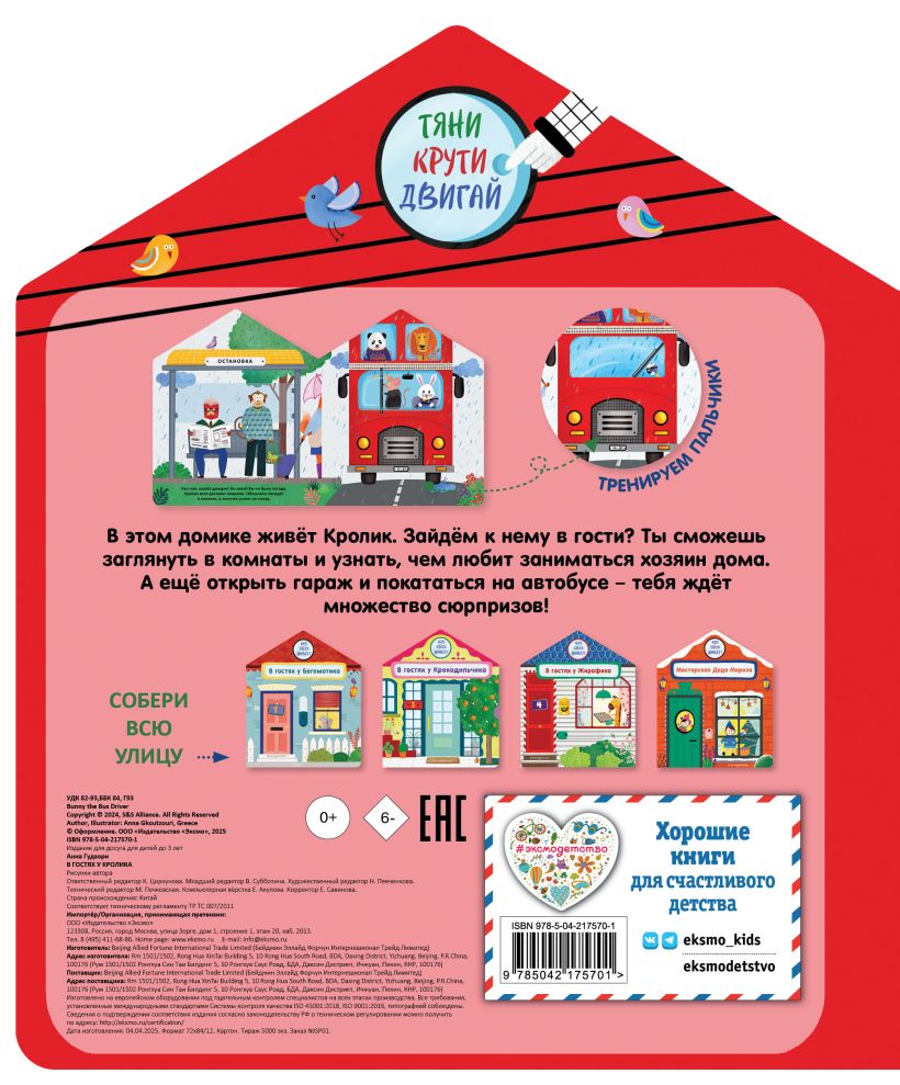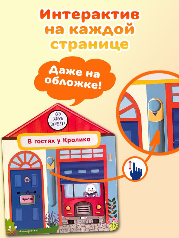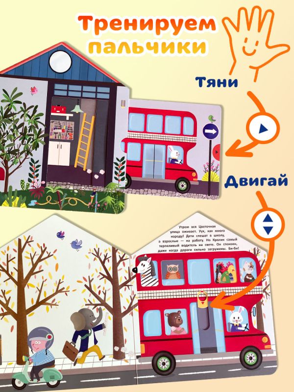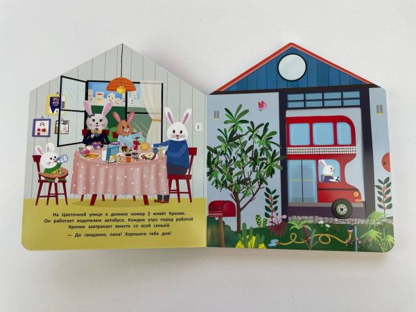 В этой интерактивной книжке-игрушке много сюрпризов: малыш сможет заглянуть в комнаты домика и узнать, чем любит заниматься дружелюбный хозяин. А ещё открыть гараж и покататься на автобусе.