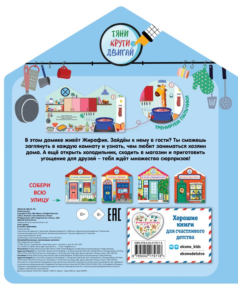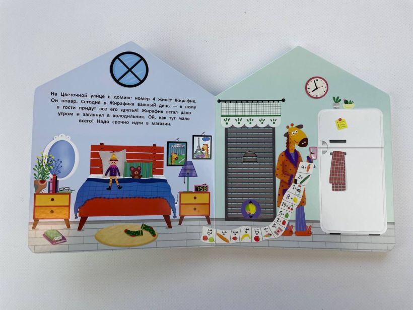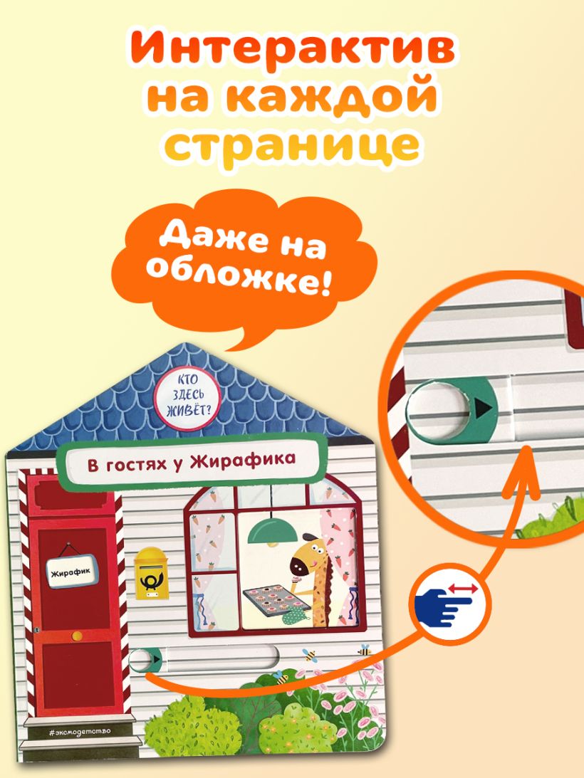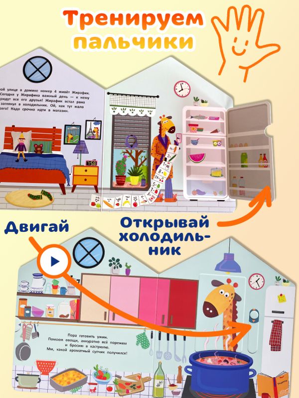 В этой интерактивной книжке-игрушке много сюрпризов: малыш сможет заглянуть в каждую комнату домика и узнать, чем любит заниматься дружелюбный хозяин. А ещё открыть холодильник, сходить в магазин и приготовить угощение для друзей.