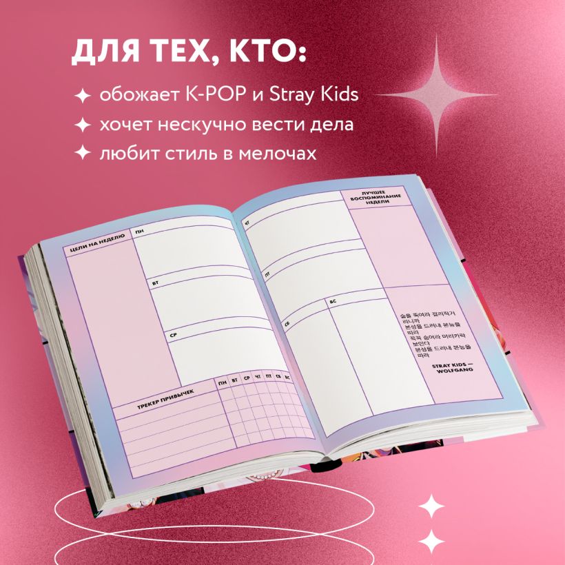 Яркий и крутой ежедневник с обворожительным V! Ежедневник, который поможет справиться с любой задачей, распланировать все дела и поднимет настроение своей стильной обложкой. Иллюстрация на ней была создана художницей pendeltur. На красочных разворотах на неделю удобно записывать планы, задачи на каждый день, отслеживать привычки. Каждый разворот украшают строчки из песен группы и вдохновляющие фразы от ее участников! Отличный подарок фанату!