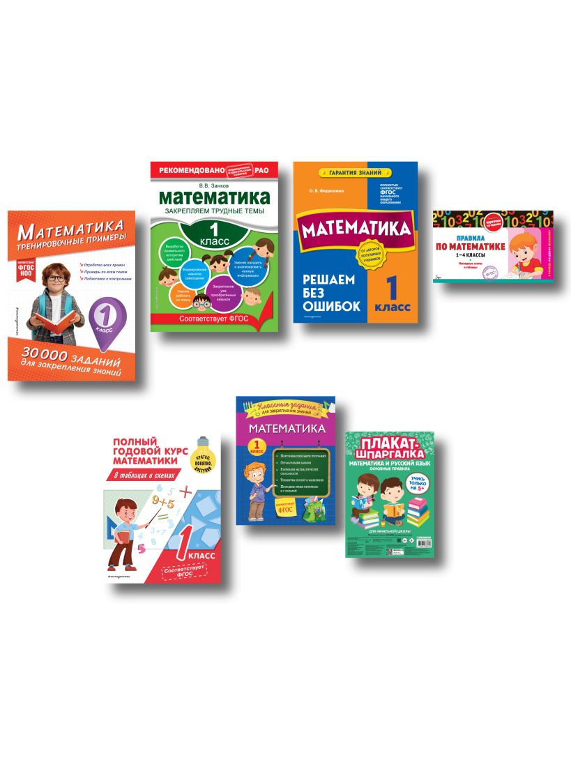 В комплект «В помощь первокласснику. Математика (+ шпаргалка в подарок)» входят книги: «Математика. 1 класс. Решаем без ошибок», «Полный годовой курс математики в таблицах и схемах: 1 класс», «Плакат-шпаргалка для начальной школы», «Математика. Тренировочные примеры. 1 класс», «Правила по математике: 1—4 классы», «Математика. 1 класс. Закрепляем трудные темы. В помощь младшему школьнику. Рекомендовано РАО», «Математика. Классные задания для закрепления знаний. 1 класс». Эти пособия помогут сделать первые шаги в освоении школьного курса, заложив крепкий и надежный фундамент для будущих знаний и успехов. Весь материал представлен в доступной, увлекательной, классической форме, чтобы ребенку было интересно заниматься. Набор книг от издательства «Эксмо» будет полезным подарком для мальчиков и девочек для повторения и закрепления пройденного материала. А шпаргалка поможет легко и наглядно запомнить систематизированный материал. Занимаясь по предложенным пособиям, ребенок улучшит свои результаты и будет получать только хорошие и отличные оценки.