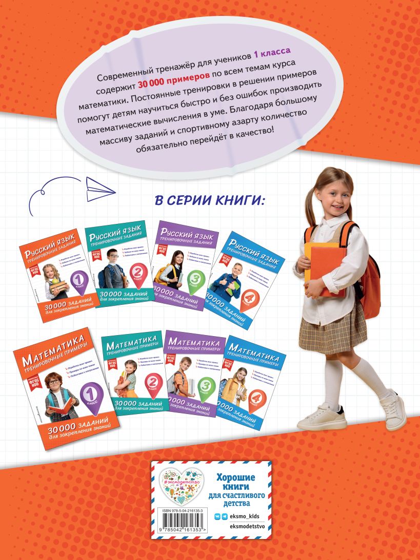 Пособие от издательства «Эксмо», соответствующее ФГОС, разработано специалистом с многолетним опытом работы и станет отличным помощником для учеников 1 класса в отработке умений и навыков, полученных на уроках математики. Решение большого количества примеров на сложение и вычитание и задач в одно и два действия в пределах 20 даст возможность школьникам в дальнейшем избежать вычислительных ошибок и довести навыки счёта до автоматизма. Занимаясь по книге, учащиеся смогут повторить такие темы, как «Количество», «Состав числа», «Сравнение»; научатся анализировать информацию и понимать учебную задачу, а также смогут закрепить пройденный материал, восполнить пробелы в знаниях, развить математические способности, повысить успеваемость по предмету. Задания в тренажере построены таким образом, чтобы не повторять, а дополнять упражнения, которые предлагаются в школе. Благодаря этому его можно использовать в сочетании с любыми из существующих учебников по математике. Кроме того, в серию входят и пособия по русскому языку для 1, 2, 3 и 4 класса. Только постоянная практика позволит школьнику уверенно чувствовать себя на уроках и получать отличные оценки.