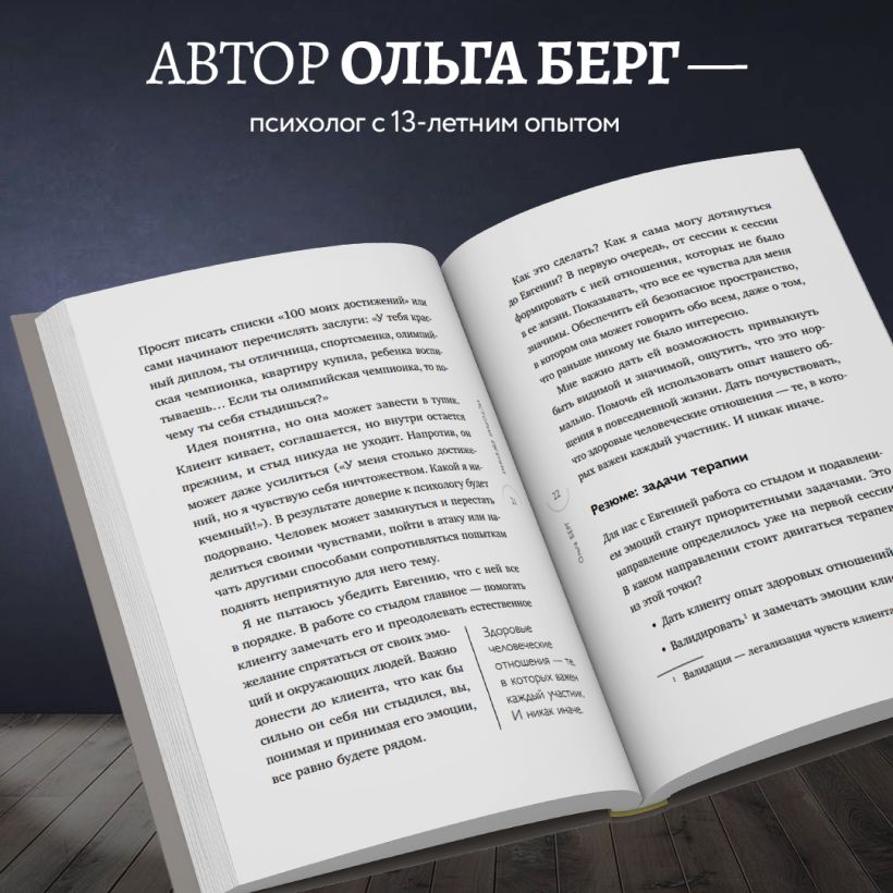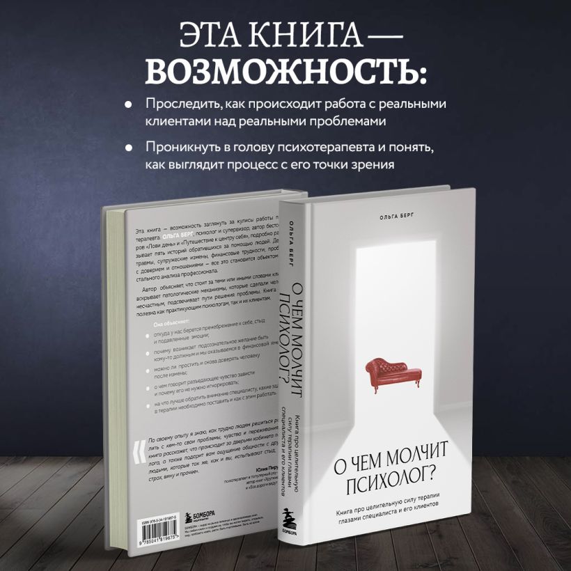 Эта книга — возможность заглянуть за кулисы работы психотерапевта. Ольга Берг, психолог и супервизор, автор бестселлеров «Лови день» и «Путешествие к центру себя», подробно рассказывает пять историй обратившихся за помощью людей. Детские травмы, супружеские измены, финансовые трудности, проблемы с доверием и отношениями — все это становится объектом пристального анализа профессионала.