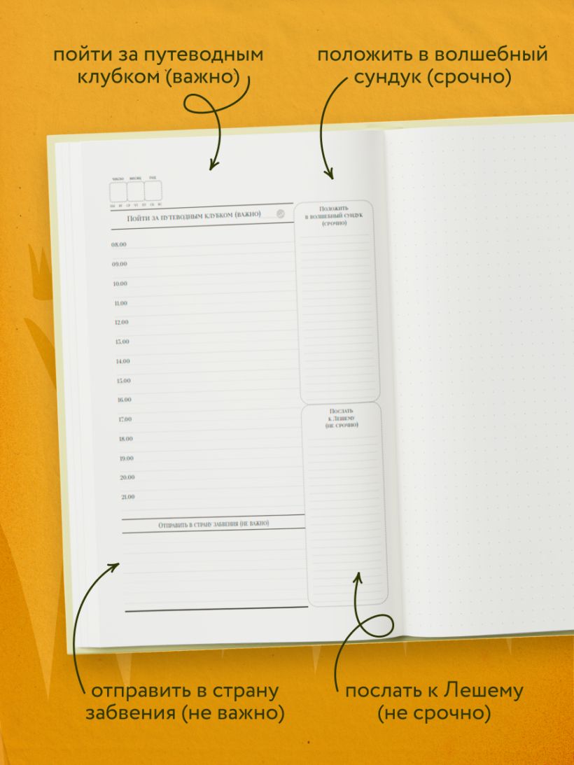 Забавный недатированный ежедневник, в котором вместо «важно срочно / не важно срочно/ важно не срочно / не важно не срочно» есть такие поля для заполнения: