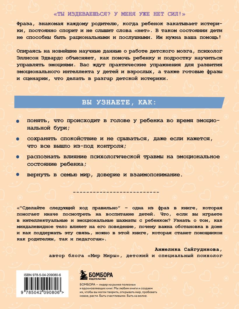 Опираясь на новейшие научные данные о работе детского мозга, психолог Эллисон Эдвардс объясняет, как помочь ребенку и подростку научиться управлять эмоциями. Вас ждут практические упражнения для развития эмоционального интеллекта у детей и взрослых, готовые фразы и сценарии, что делать в разгар детской истерики, а также рекомендации для родителей и педагогов по обустройству детской комнаты или школьного кабинета для улучшения эмоционального состояния ребенка.