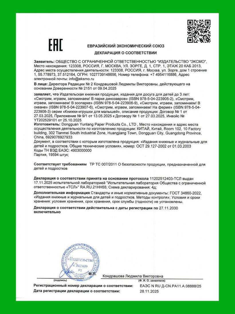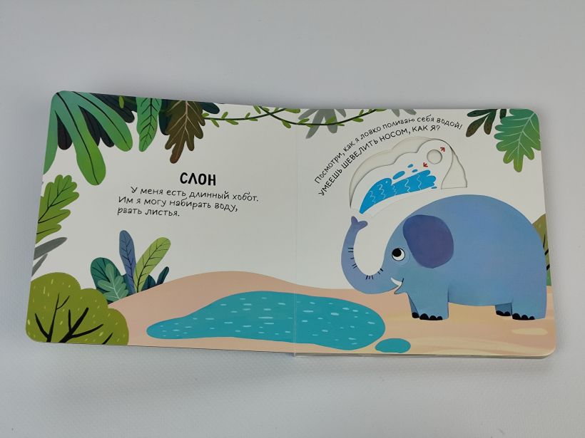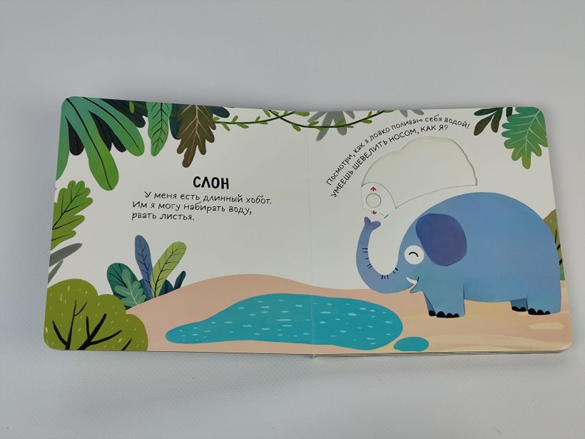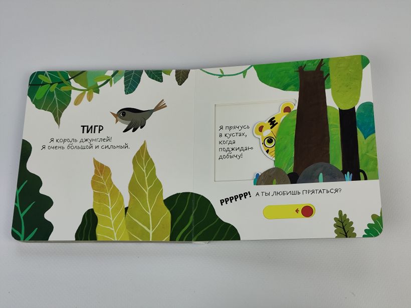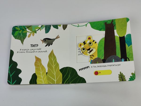 Книга сделана из толстого прочного картона с безопасными скругленными углами — малыш сможет легко переворачивать странички самостоятельно. Игра с книгой начинается прямо с обложки, ведь там находится подвижная деталь!