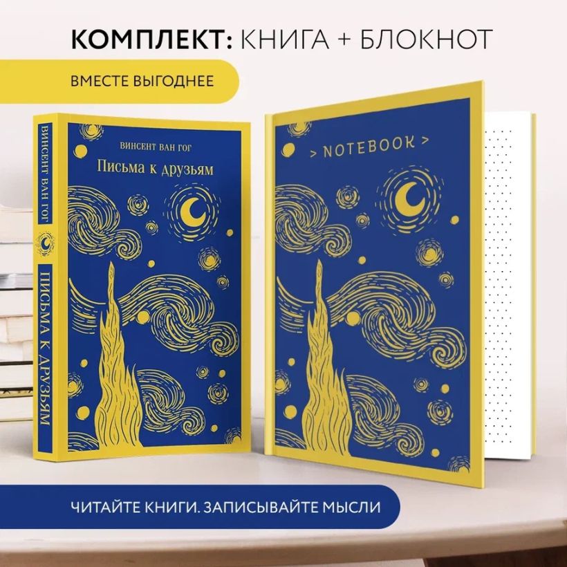 В комплект входят «Письма к друзьям» Ван Гога и тематический блокнот в точку, повторяющий обложку книги.