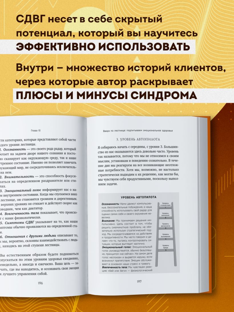 "Книга затрагивает важные аспекты СДВГ, выходящие за рамки официальных критериев и бытующих стереотипов. Люди с СДВГ почувствуют валидацию и получат нестандартные практические инструменты для преодоления трудностей. Текст пропитан сопереживанием, добрым юмором и оптимизмом. Обязательно прочтите эту книгу, если у вас, ваших близких или клиентов есть СДВГ".