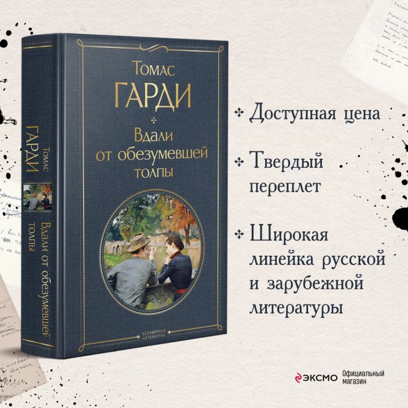 «Вдали от обезумевшей толпы» — история независимой хозяйки фермы, внимания которой добиваются трое: богатый джентльмен, отчаянный сержант и рассудительный фермер. Нелегкая проблема выбора, вечная драма отношений мужчины и женщины, интриги, тайны и настоящая страсть в романе, ставшем первым литературным успехом автора.