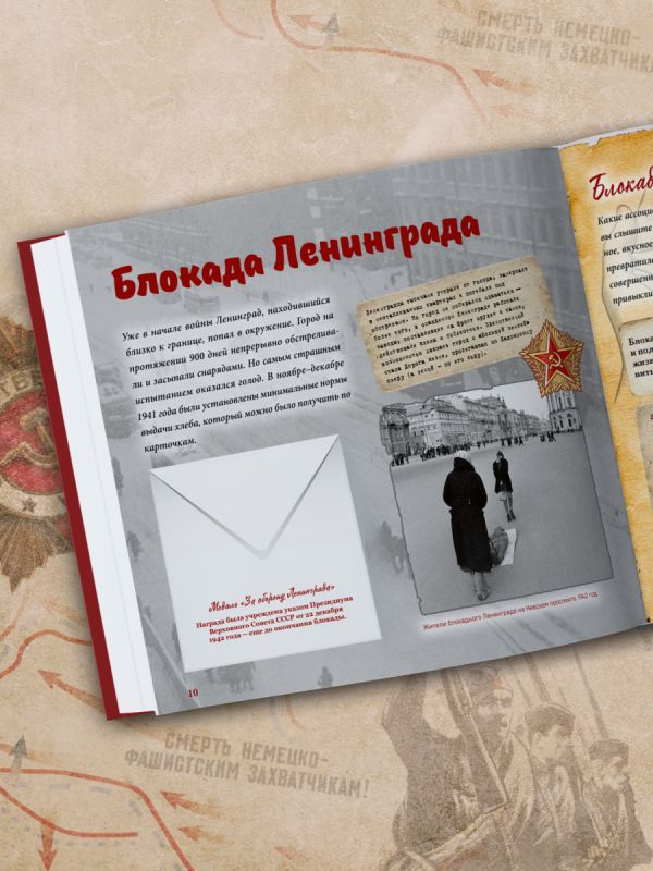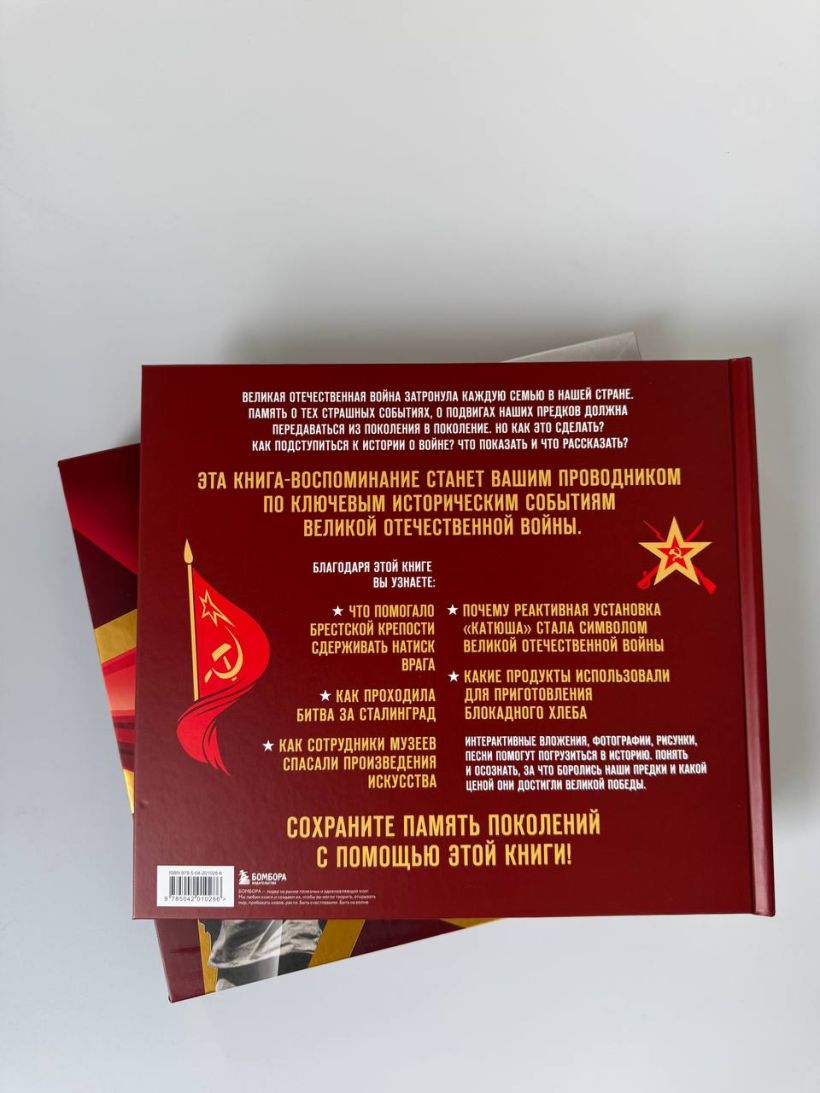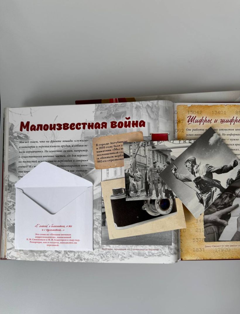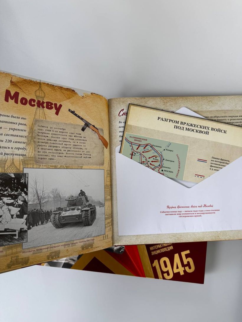 В 2025 году наша страна будет отмечать 80 лет со дня победы советского народа в Великой Отечественной войне, память о которой важно сохранить и передать следующим поколениям. Эта возможность стала еще более реальной благодаря подарочной pop-up книге с интерактивными вложениями «Великая Отечественная война. Интерактивная семейная энциклопедия». Полное погружение в период 1941—1945 годов не оставит никого равнодушным: с помощью этой книги вы сможете проникнуться первыми минутами одного из самых страшных периодов в нашей истории, послушав объявление о войне голосом Левитана, а также детально рассмотреть карточки для получения блокадного хлеба, прочитать рецепт его приготовления и выдержки из писем тех, кто 872 дня провел в окружении фашистов в Ленинграде.