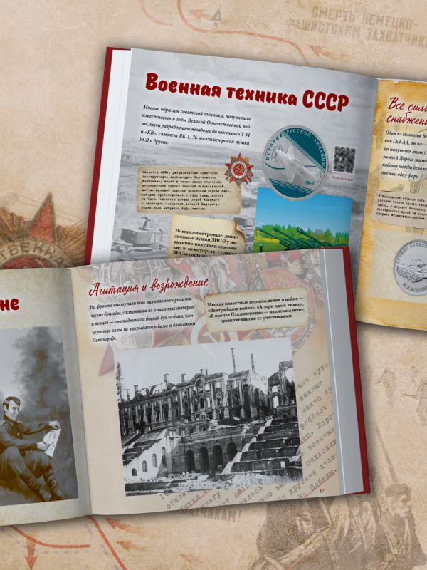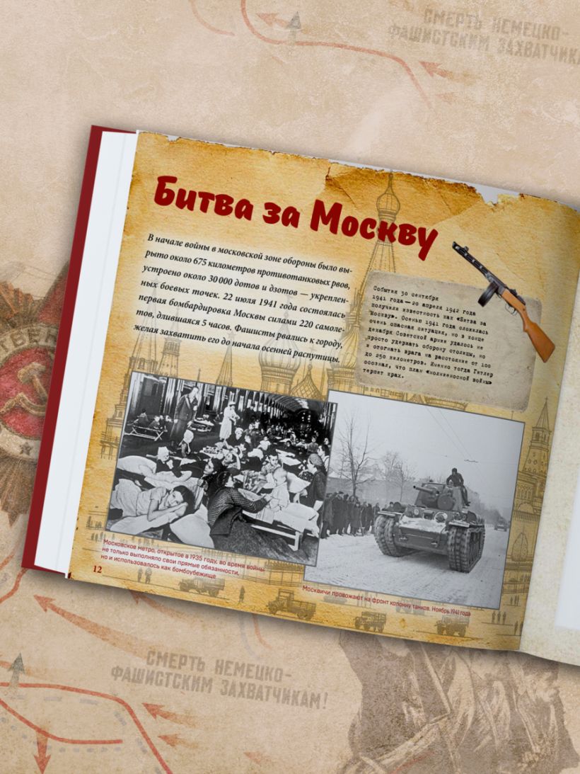 Каждый разворот этой книги — отдельный этап на пути к победе. При изучении битв за Москву, Сталинград или Курск в конвертах вас ждут подробные схемы с расстановками сил. Рассматривая на дополнительных вложениях военную технику, вы сможете услышать песни, поддерживающие боевой дух советских солдат.