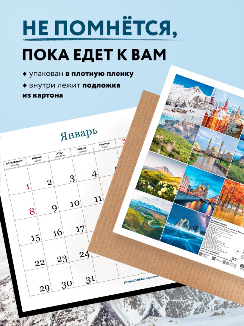 Календарь раскроет всю красоту нашей великой страны. Невероятные горы, реки и озера, удивительная архитектура, бескрайние просторы и природа, от которой захватывает дух, — всем этим богата Россия. В календаре собраны разнообразные достопримечательности нашей страны от панорамы Москвы до вулканов Камчатки.