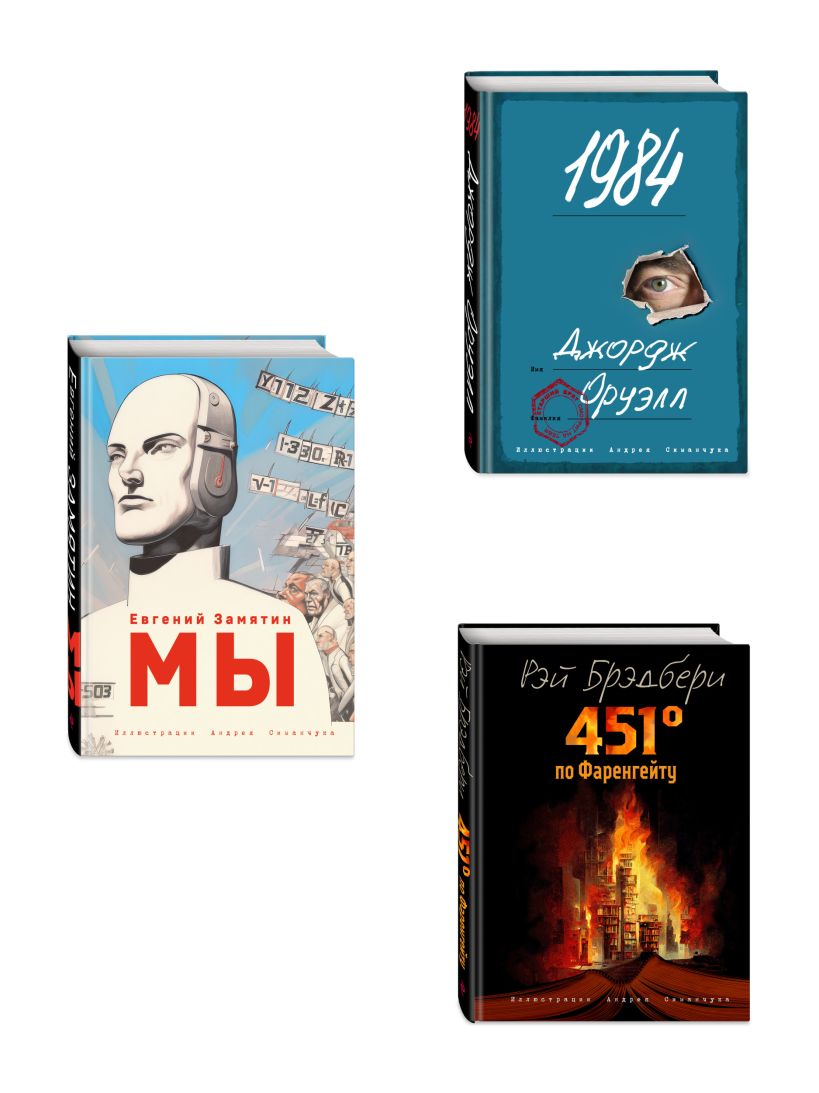 В комплект изданий вошли величайшие романы-антиутопии XX века: «1984» Дж. Оруэлла, «451 градус по Фаренгейту» Р. Брэдбери и «Мы» Евг. Замятина. Книги в твёрдом переплёте. Удобный формат. Белая бумага. Чёткий, удобный для чтения шрифт. Стильное художественное оформление. Выразительные чёрно-белые иллюстрации.