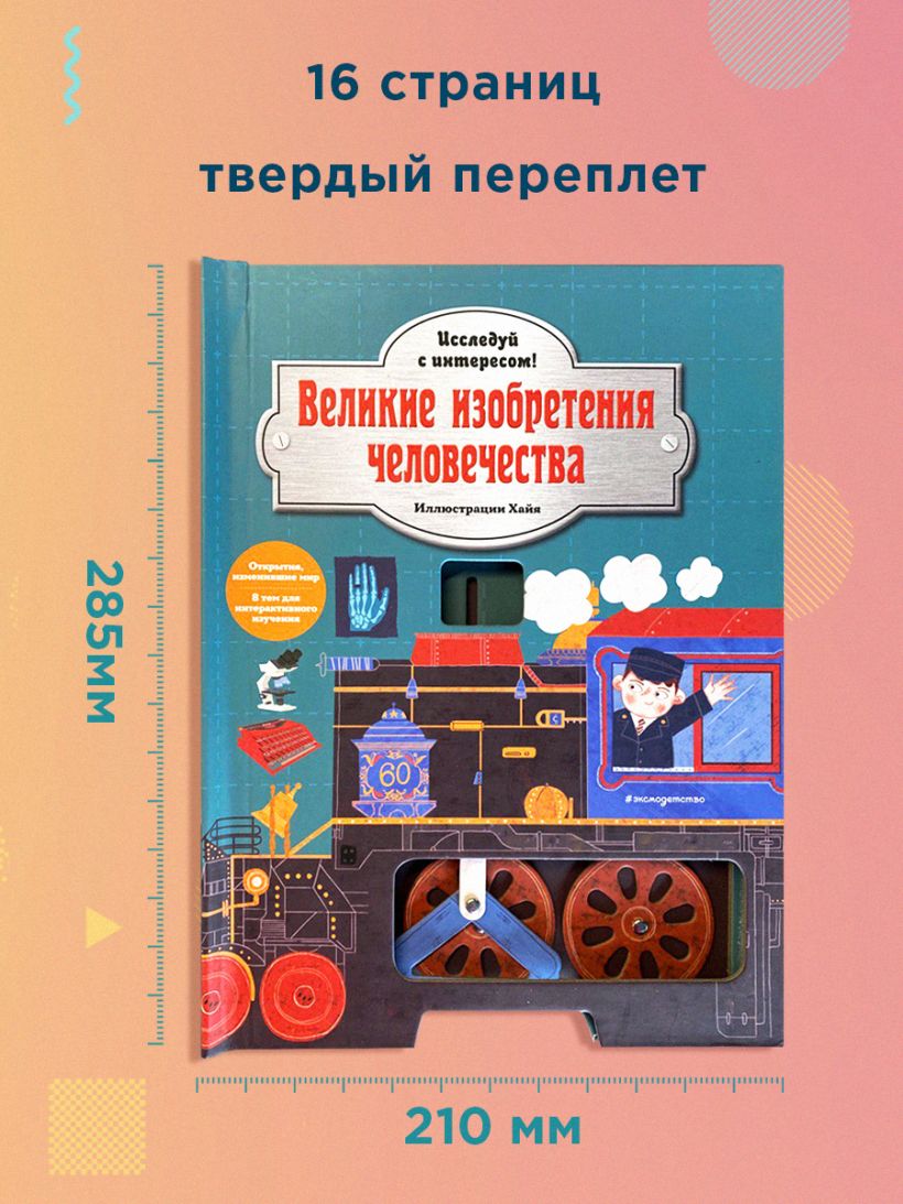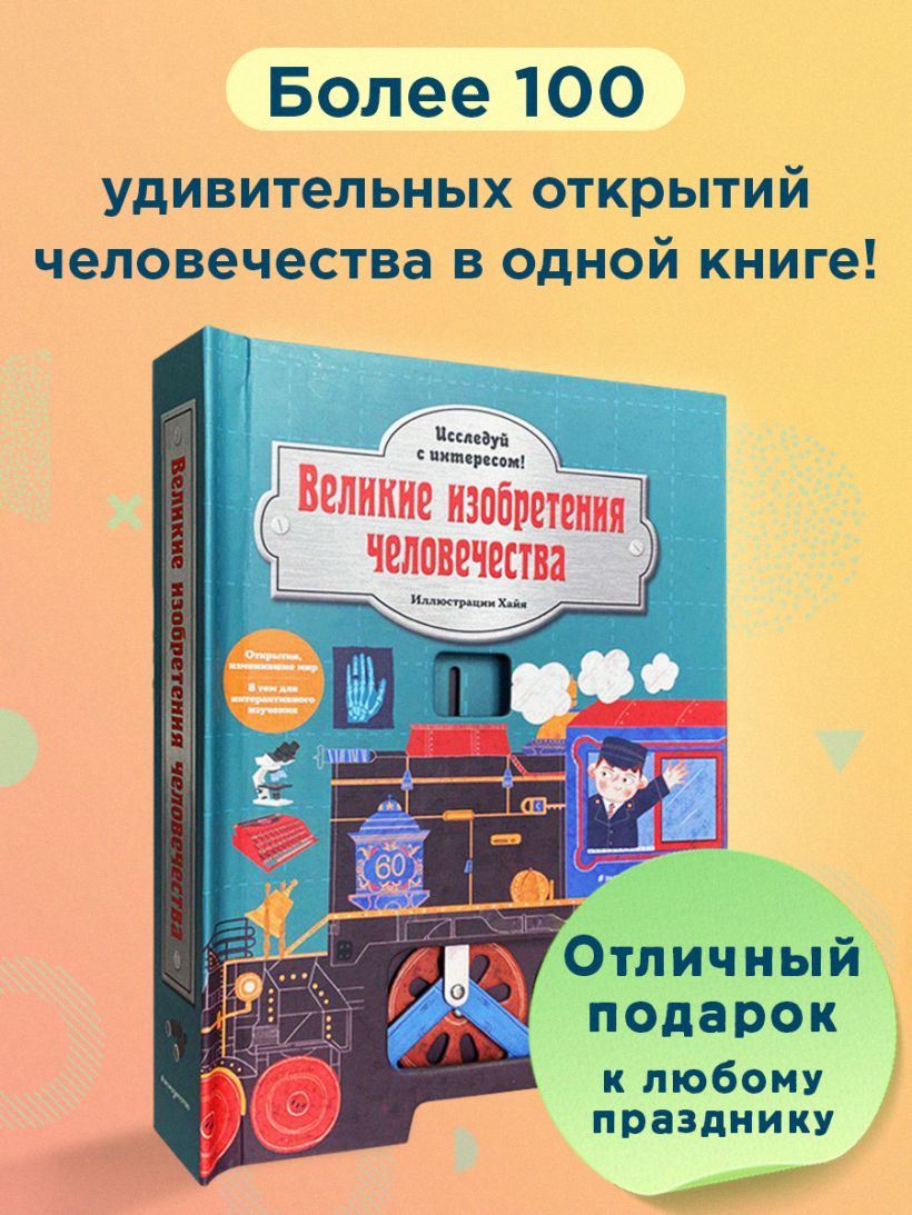 Представляем издание «Великие изобретения человечества. Исследуй с интересом!» — увлекательную книгу с подвижными и объёмными элементами. В ней представлено более 100 потрясающих открытий древности и современности. На каждом развороте книги много интерактивных элементов, которые делают познавательный процесс ещё более захватывающим! Эта книга станет отличным подарком ребёнку и пробудит интерес к удивительному миру науки.