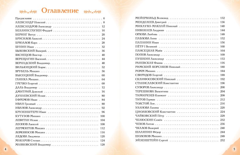 Эта большая подарочная книга рассказывает о более чем 60 наших знаменитых соотечественниках из разных периодов истории России: военачальниках, учёных и изобретателях, писателях, художниках, музыкантах, артистах, путешественниках, лётчиках и космонавтах… И история каждого из них вдохновляет юных читателей на собственные свершения, подаёт достойный пример для подражания и прививает интерес и любовь к родной стране.