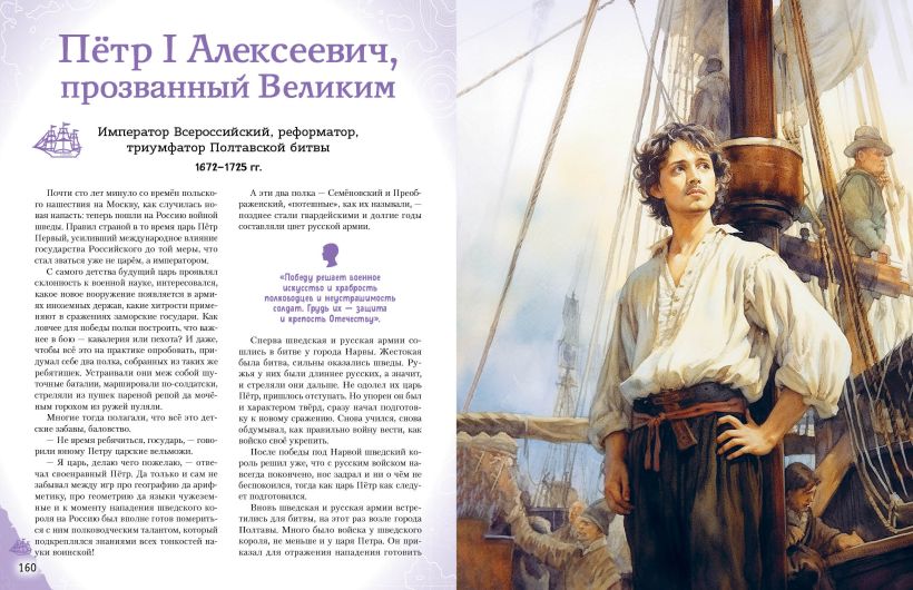 Такие имена, как Пётр Первый, Александр Суворов, Екатерина Вторая, Пётр Чайковский, Софья Ковалевская, знает любой человек в нашей стране. Но все великие люди тоже когда-то были детьми. Хотите узнать, во что играли будущие исторические личности? Чем увлекались в детстве? Как искали свой путь, искали себя на нелёгких жизненных дорогах? Ведь они так же, как и все мы, одолевали за партой неподдающиеся науки, отстаивали собственное мнение в спорах; у них были свои детские огорчения и радости. И далеко не всё получалось с первого раза... Тогда скорее открывайте эту книгу! В ней вас ждут 44 биографических рассказа о наших великих соотечественниках разных эпох и профессий. Каждый из них — образец силы воли и стойкости характера, мотивирующий ребят на собственные свершения. Их дополняют интересные факты и красочные полосные иллюстрации, поэтому вас ждёт увлекательное времяпрепровождение для всей семьи! Книги серии получили заслуженно высокую оценку — в 2024 году они были номинированы на премию Российского общества «Знание» в категории «Лучшая просветительская книга». НАСТОЯЩИЙ ПОДАРОК ДЛЯ ВСЕХ, КТО ГОРДИТСЯ ИСТОРИЕЙ И КУЛЬТУРОЙ НАШЕГО ОТЕЧЕСТВА!