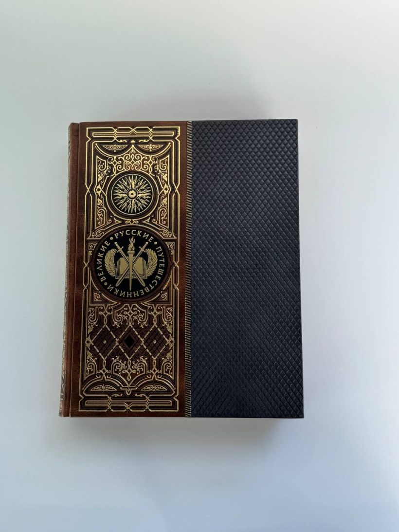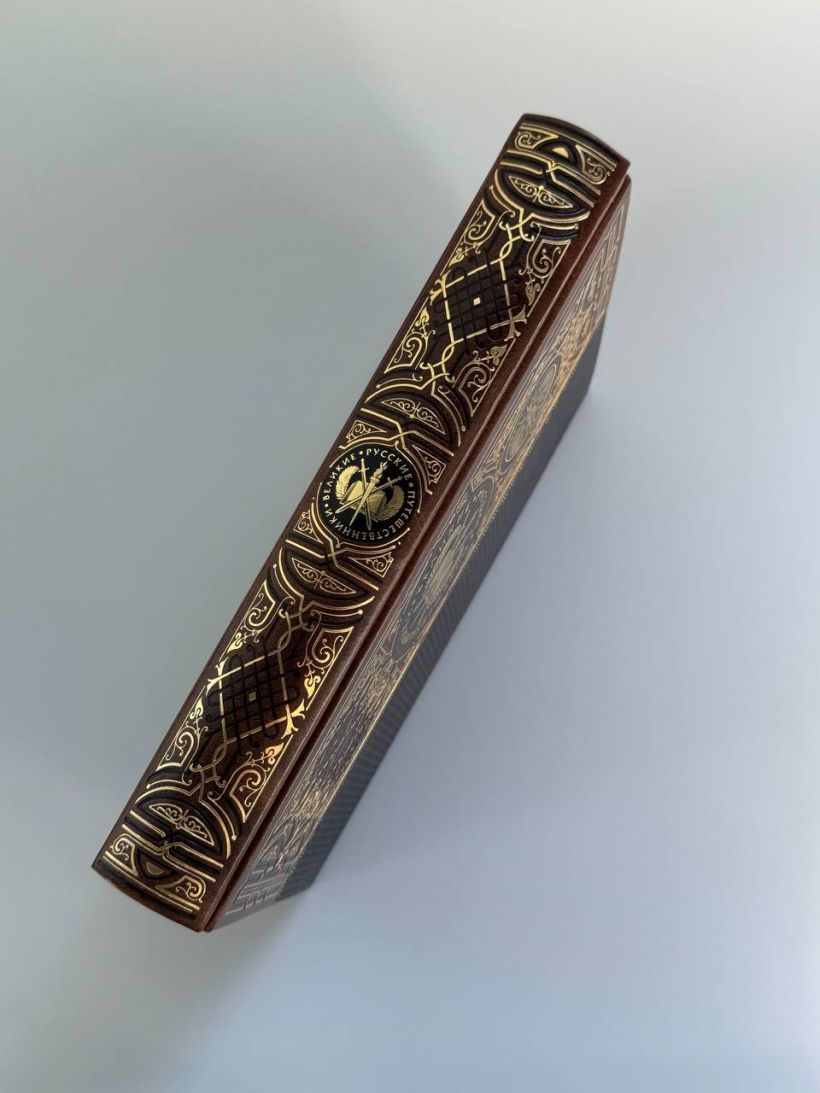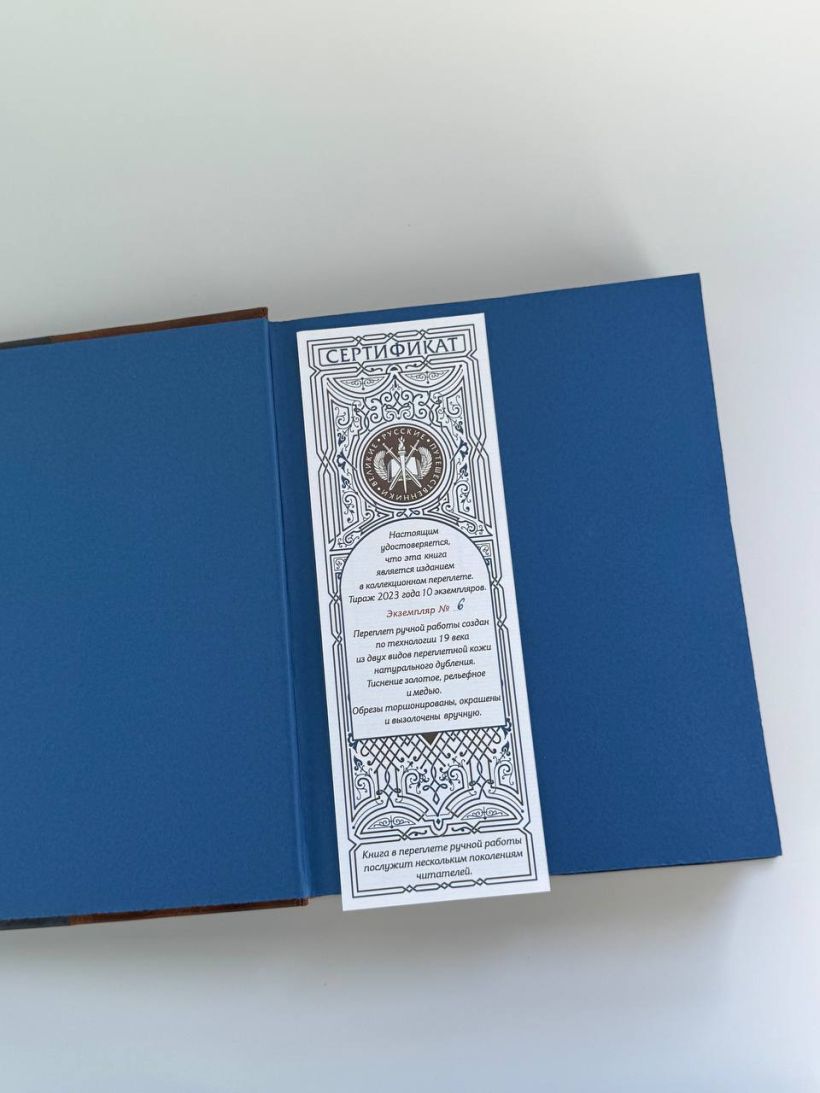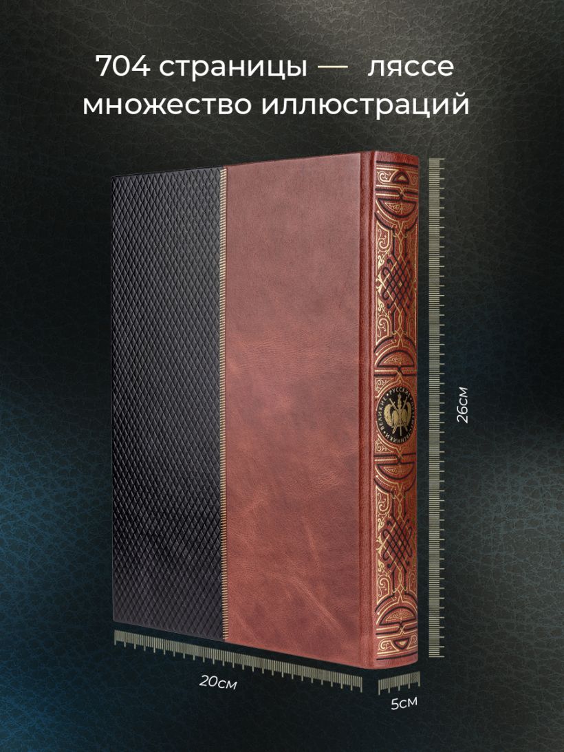 Книга в коллекционном инкрустированном переплете. Переплет изготовлен их двух видов натуральной кожи по технологии XIX века и украшен сплошным тончайшим тиснением, в полном соответствии с лучшими образцами переплетов европейских мастеров. Использовано 3 вида тиснения — золото, черный натуральный пигмент и рельефное тиснение. В оформлении переплета использованы универсальные растительно-геометрические плетеные орнаменты, благодаря им книга будет отлично смотреться на любой книжной полке. Лента для закладывания страниц и каптал, скрепляющий верх и низ объемного тома, изготовлены из шелка. Бумага в книге легкая, матовая, что обеспечивает комфортное чтение даже длительное время, иллюстрации напечатаны на мелованной бумаге. Обрез книги торшонирован, окрашен и вызолочен вручную. К книге прилагается красочный сертификат, подтверждающий уникальность издания, он вложен в каждый экземпляр и пронумерован.