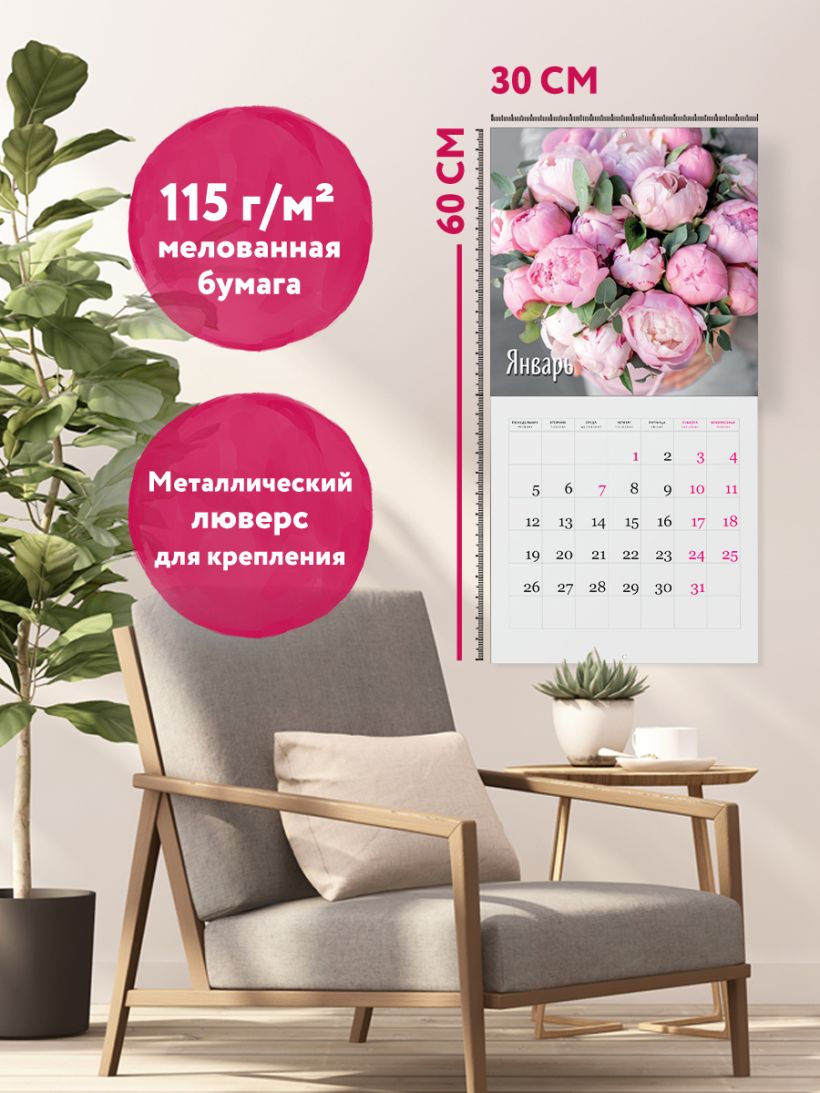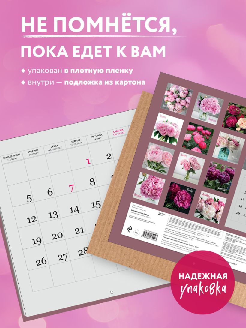 Белые, красные, розовые — великолепные пионы в одном календаре. Каждый месяц представлен оригинальным букетом в соответствии с цветовой гаммой сезона.