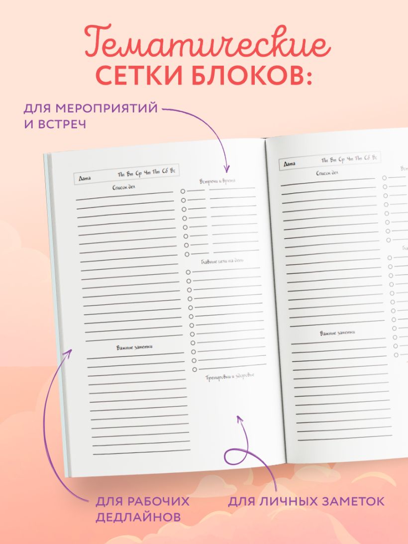«К себе нежно» — это ежедневник от автора одноименного бестселлера. Он не про успешный успех и карьерную мотивацию, он — про бережное отношение к себе, про то тихое и нежное, что у вас внутри. С помощью этого ежедневника вы не только сможете помнить о предстоящих делах и задачах, но и обретете верного друга, который будет от страницы к странице обнимать вас словами. В ежедневнике вас ждут: • блоки для записей дел на будни и выходные; • «обнимательная» фраза-напутствие на каждую неделю; • цитаты из книги «К себе нежно»; • рубрика «Важно» для записи задач, требующих особого внимания; • рубрика «Чем я себя порадую?», куда можно вписывать все то приятное, что вы собираетесь сделать для себя; • трекеры для двух привычек; • необычный вопрос на «подумать» и «почувствовать» — для самопознания и исследования своих глубин; • трекер жизненного изобилия, который поможет убедиться: ваша жизнь намного богаче и интереснее, чем кажется; • «носочек накоплений», помогающий следить за тем, как копятся деньги на мечту; • раскраски, которые помогут развеяться, отвлечься или просто занять руки во время скучного совещания :) • и другие авторские материалы.