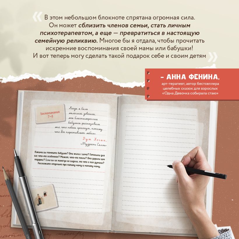 «В этом небольшом блокноте спрятана огромная сила. Он может сблизить членов семьи, стать личным психотерапевтом, а еще — превратиться в настоящую семейную реликвию. Многое бы я отдала, чтобы прочитать искренние воспоминания своей мамы или бабушки! И вот теперь могу сделать такой подарок себе и своим детям». — Анна Фенина, арт-терапевт, автор бестселлера целебных сказок для взрослых «Одна Девочка собирала стаю» и др.