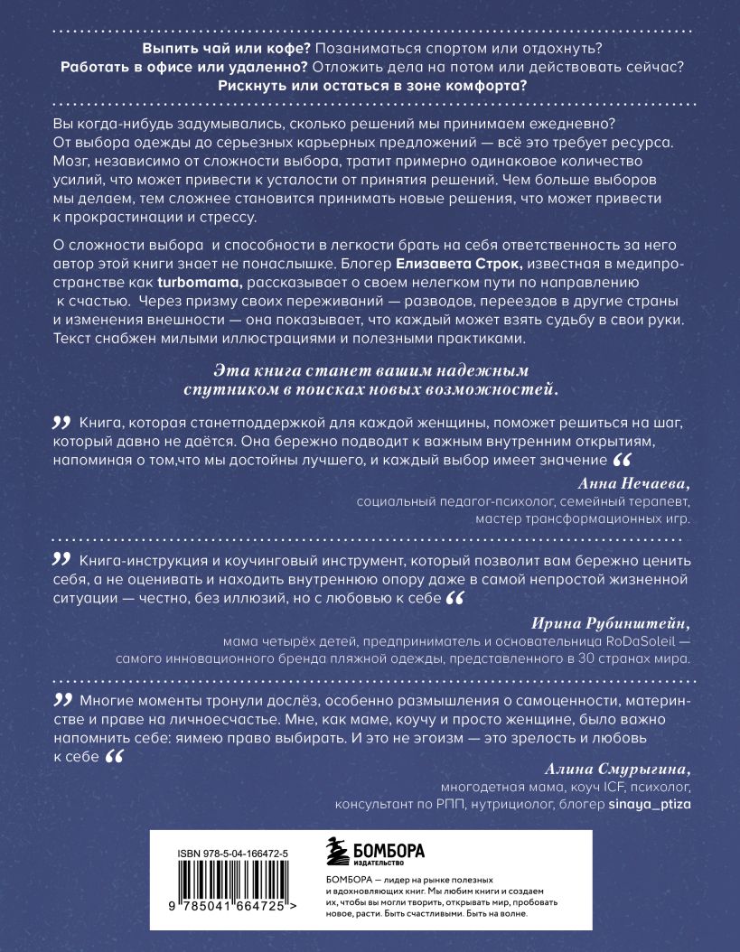В этой книге нет пафоса — она очень честная. Местами будто разговариваешь с подругой, которая прошла свой путь и делится опытом, не учит, а вдохновляет. Очень откликнулись моменты про то, как мы часто живём чужими сценариями, боимся делать выбор, потому что “а вдруг будет хуже”. Лиза очень тонко поднимает тему внутренней опоры и доверия к себе. После каждой главы мне хотелось останавливаться и переосмыслять — а я-то сама сейчас живу из выбора или по привычке?