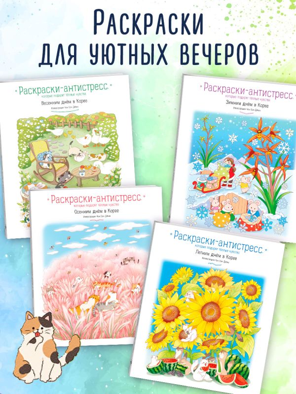 Хозяйка двух очаровательных котиков всегда мечтала погулять с ними по своим любимым местам живописного Сеула. Вот только в Корее выгуливать домашних кошек запрещено... Так появилась эта раскраска от популярнейшего корейского иллюстратора Пан Джису, художника обложек ваших любимых романов: «Добро пожаловать в "Книжный в Хюнамдоне"», «Магазин шаговой недоступности», «Книжная кухня» и многих других! 60 уютных иллюстраций, где котики Тони и Тор путешествуют по тихим корейским улочкам и самым волшебным местам Сеула, наслаждаются красотой всех времен года и приглашают каждого читателя присоединиться к их прогулке. Раскрасьте обложку любимой книги: специальные версии иллюстраций к «Добро пожаловать в "Книжный в Хюнамдоне"», «Магазин шаговой недоступности», «Книжная кухня», где котики посещают места из культовых хилинг-романов! Милейшая хилинг-раскраска для поклонников очаровательных корейских историй и любителей котиков. Нежные иллюстрации для каждого сезона с самыми уютными местечками волшебного Сеула.